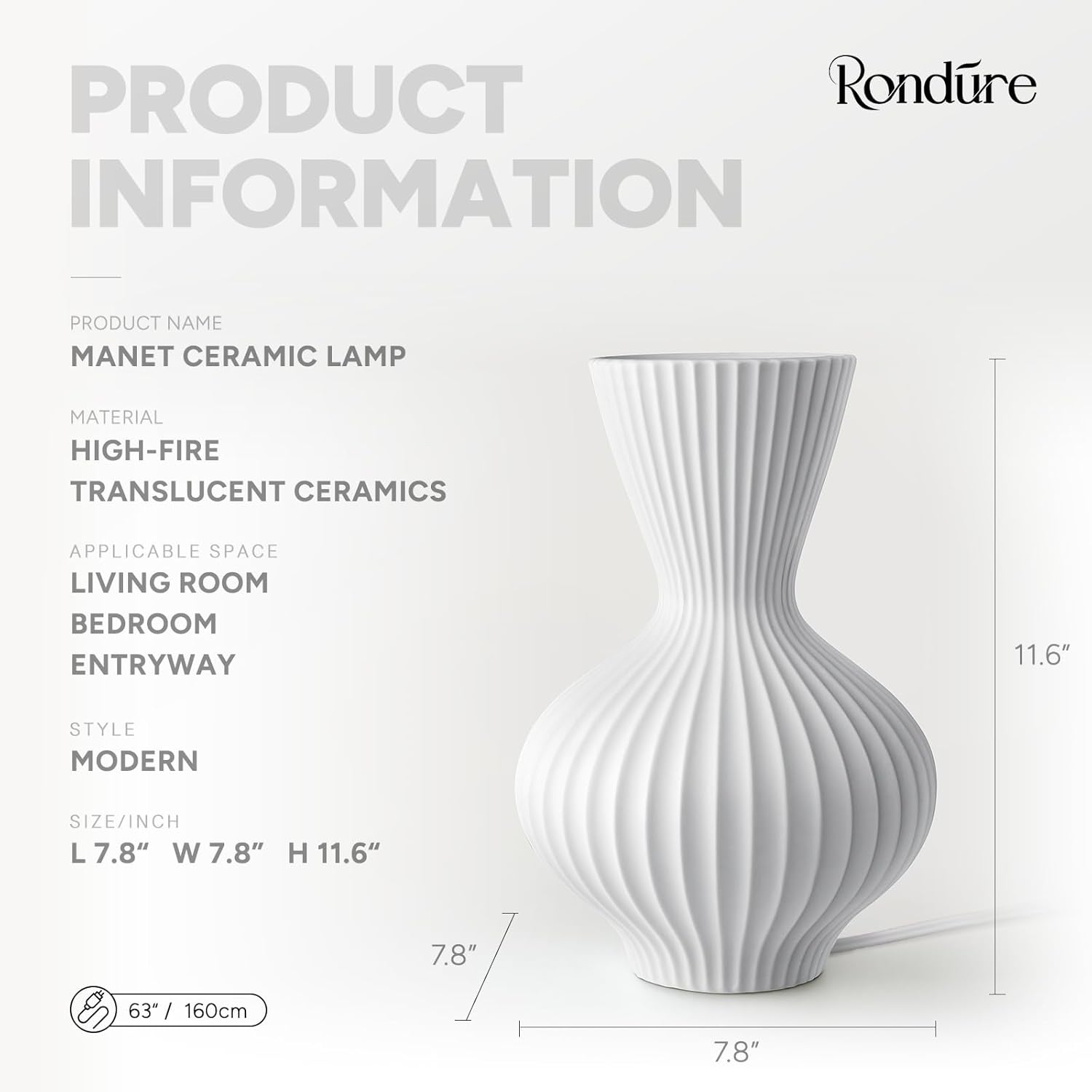 RONDURE 11.6" Modern Ceramic Table Lamp, Modern Bedside Lamps for Bedroom, Living Room and Nightstand, White Translucent Ceramic Shade, Warm Ambient Lighting, Home Decor