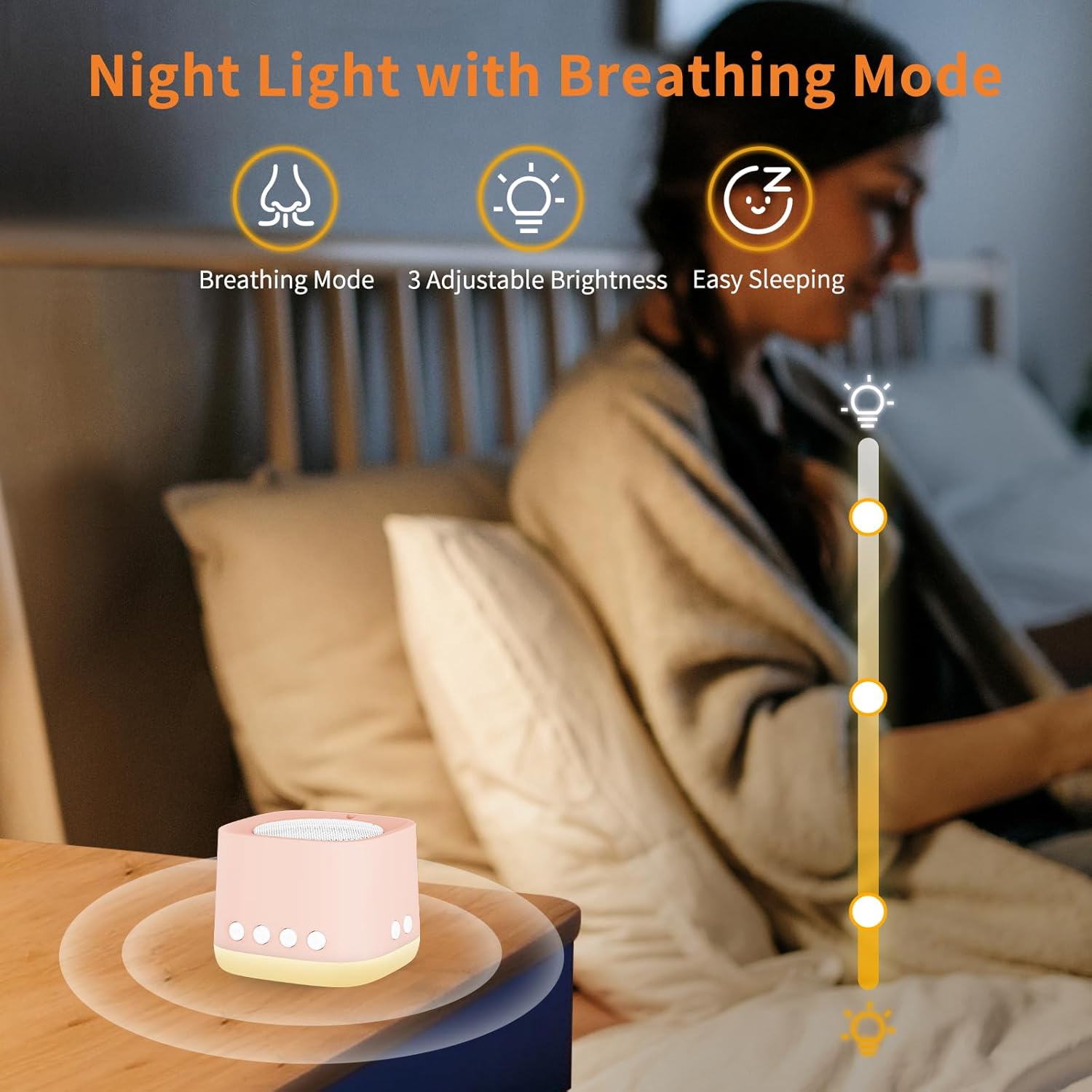 • 【Night Light with Dynamic Breathing & Timer Functions】: Our portable white noise machine offers night light (Long press to turn off the light), which emulates the natural rhythm of inhaling and exhaling,to create a calm and peaceful environment, ideal for better sleep. It also serves as a great privacy tool in the office. The white noise sound machine equipped with 4 time control, you can set the to automatically turn off after your preferred duration—30, 60, 90 minutes, or play continuously