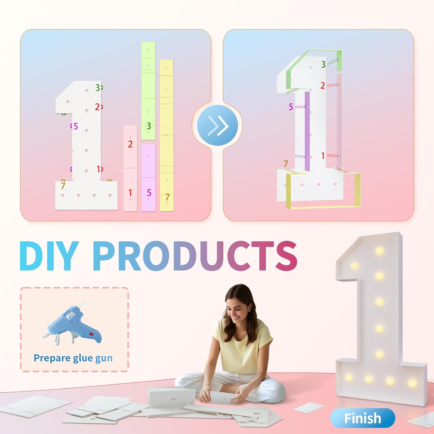 • Assembly Needed: Each marquee numbers 30 are pre-cut frame with slots, 1) Match the slots on the board and put all boards together by hot glue. 2) Screw the bulbs on the board and install 3 AA batteries. (Noted: Glue gun and batteries are not included)