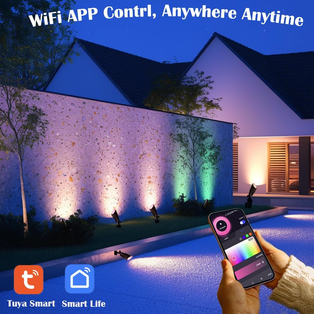 • 2. Smart Voice & App Control: Easily control your outdoor spot lights with Alexa, Google Assistant, or the Tuya Smart Life app. Adjust the colors, brightness, and schedules remotely from anywhere. Whether you're at home or away, you can change the mood or set up automated lighting for added convenience and energy savings.