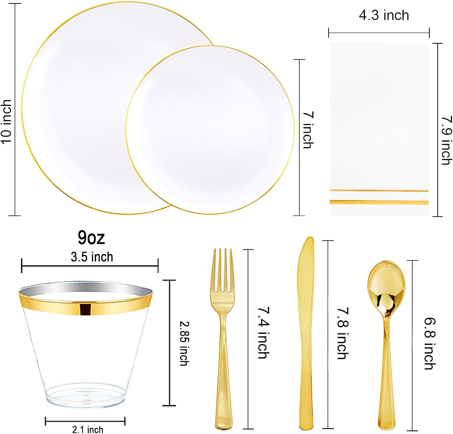 • ALL-IN-ONE 50-GUEST PARTY SET:The gold dinnerware sets include 50pcs dinner plates (10"), 50pcs dessert plates (7"), 150pcs gold silverware 50pcs napkins, and 50pcs cups—everything needed for weddings, birthdays, or summer barbecues. No more mismatched utensils or last-minute runs to the store!