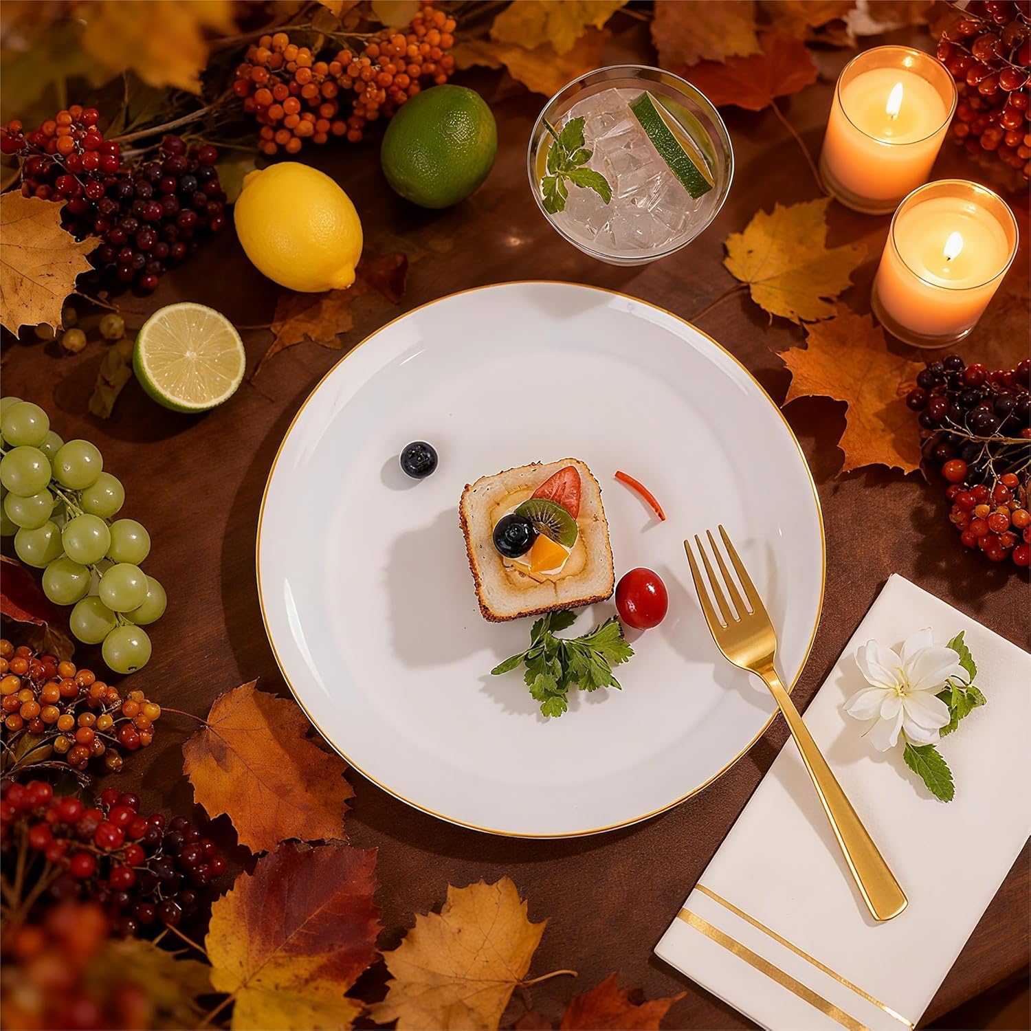 • Elegant White With Gold Rim Design:Classic white plastic plates with gold rim add sophistication to any table.Our gold plates and napkins party supplies versatile for upscale weddings, casual brunches, or holiday gatherings—effortlessly elevates decor without extra cost.