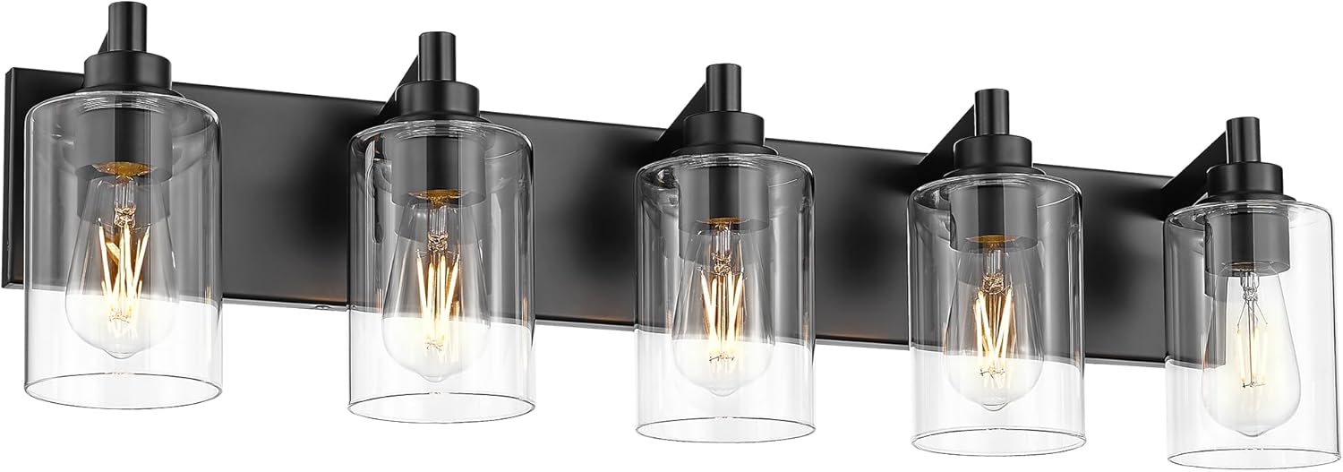 5-Light Bathroom Light Fixtures, 30 Inch Black Vanity Light with Cylinder Clear Glass Shade, Modern Vanity Lighting Fixtures Over Mirror, VL143-MB-5