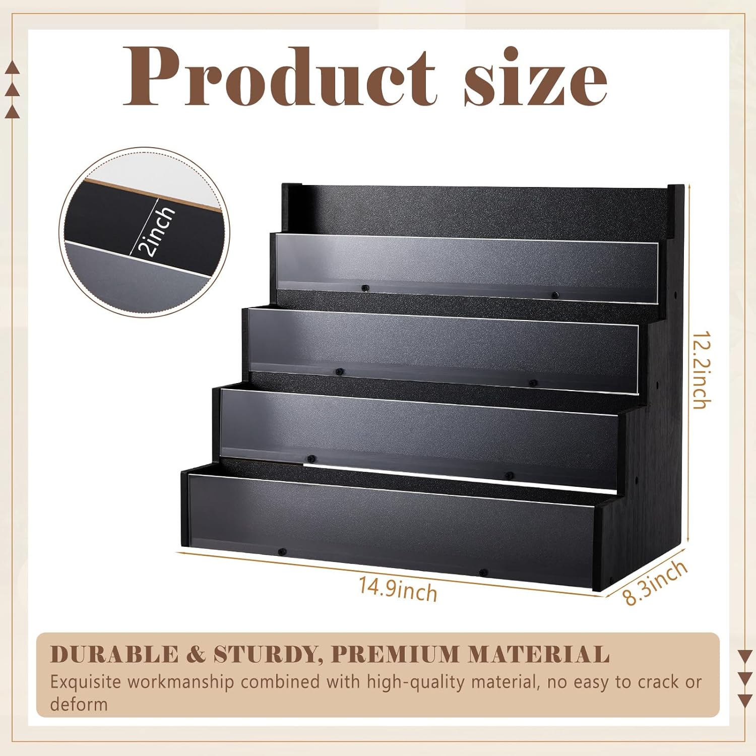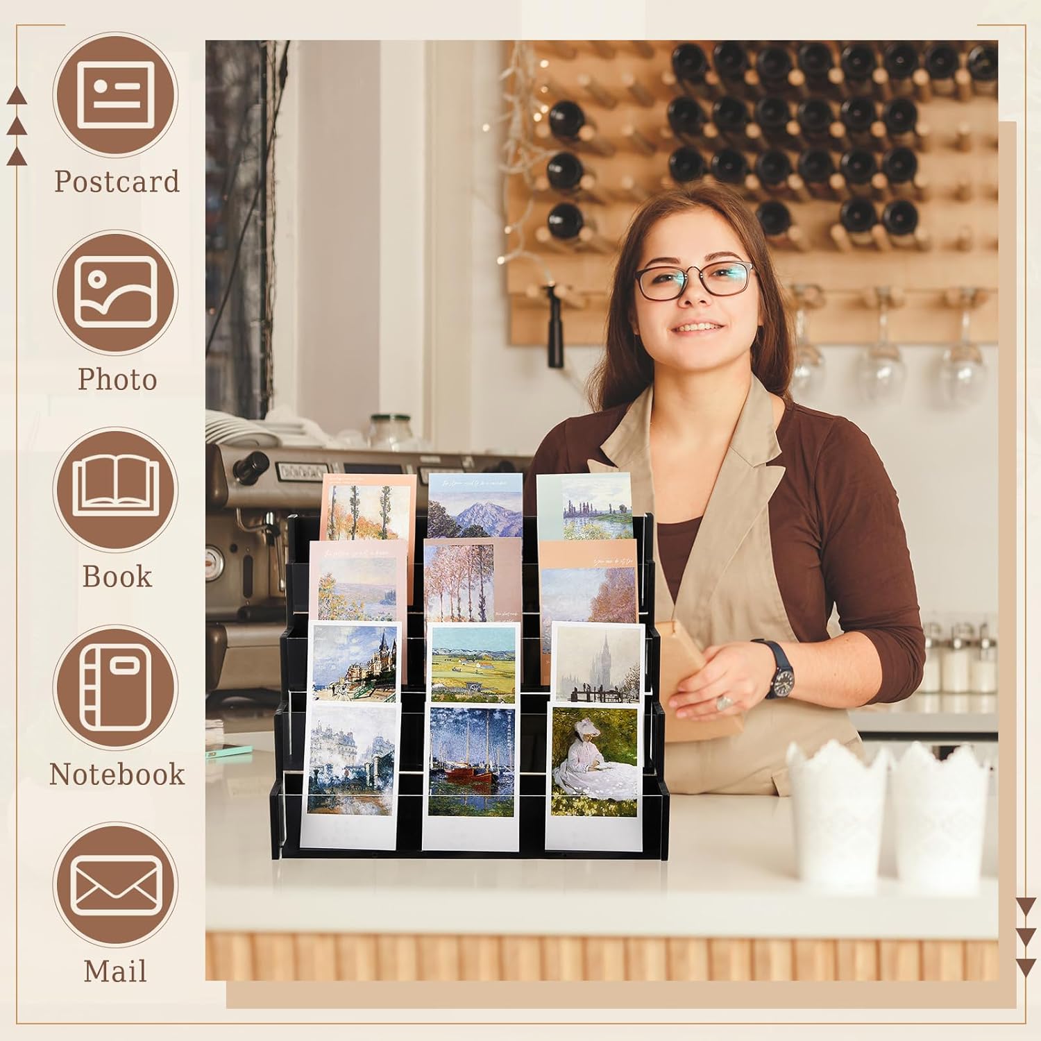 • Impressive Dimensions: our greeting card display stand boasts an overall size of about 14.96 x 12.2 x 8.27 inches, providing an ideal fit on your counter's pace; Each of its 4 tiers are about 2.8 inches high and 2 inches wide
