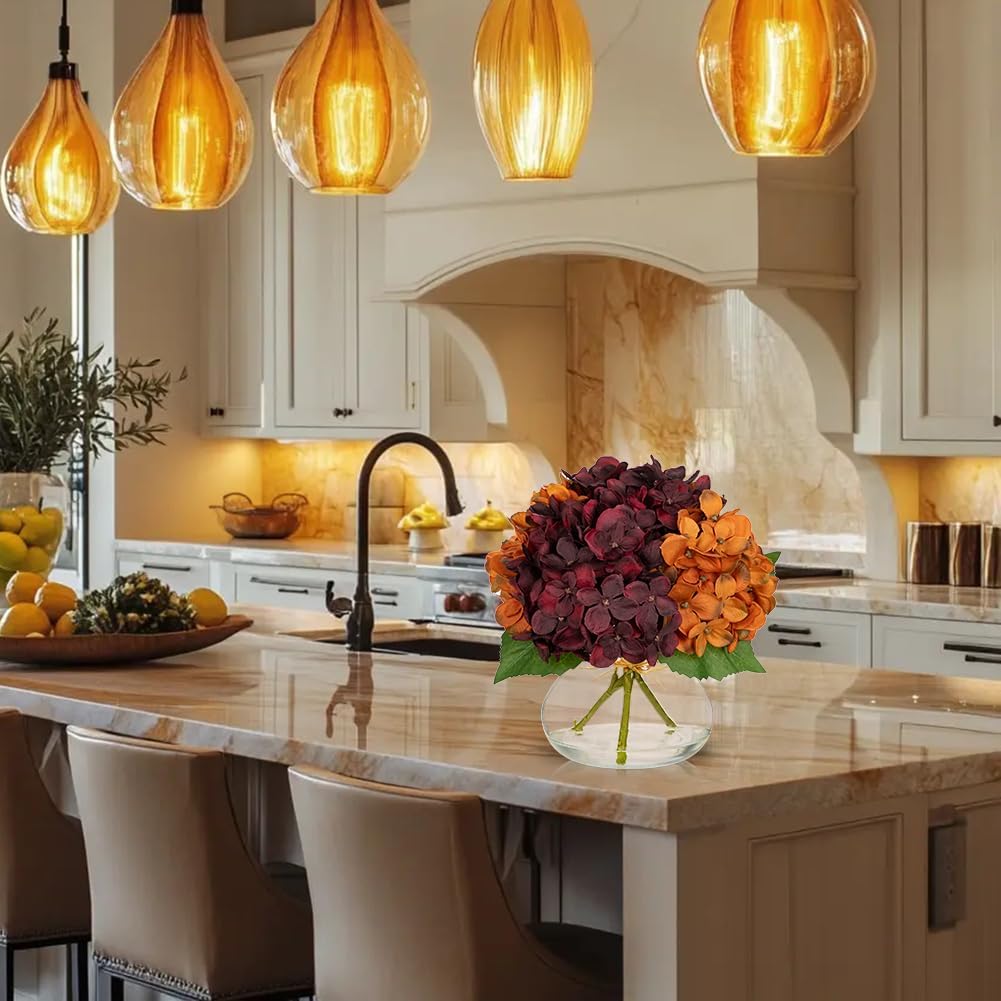 Hollyone Fall Hydrangea Artificial Flowers for Decoration with Glass Vase Dark Red Orange Autumn Silk Faux Flower Arrangements with Faux Water Fake Bouquet Table Centerpiece Fall Decorations for Home