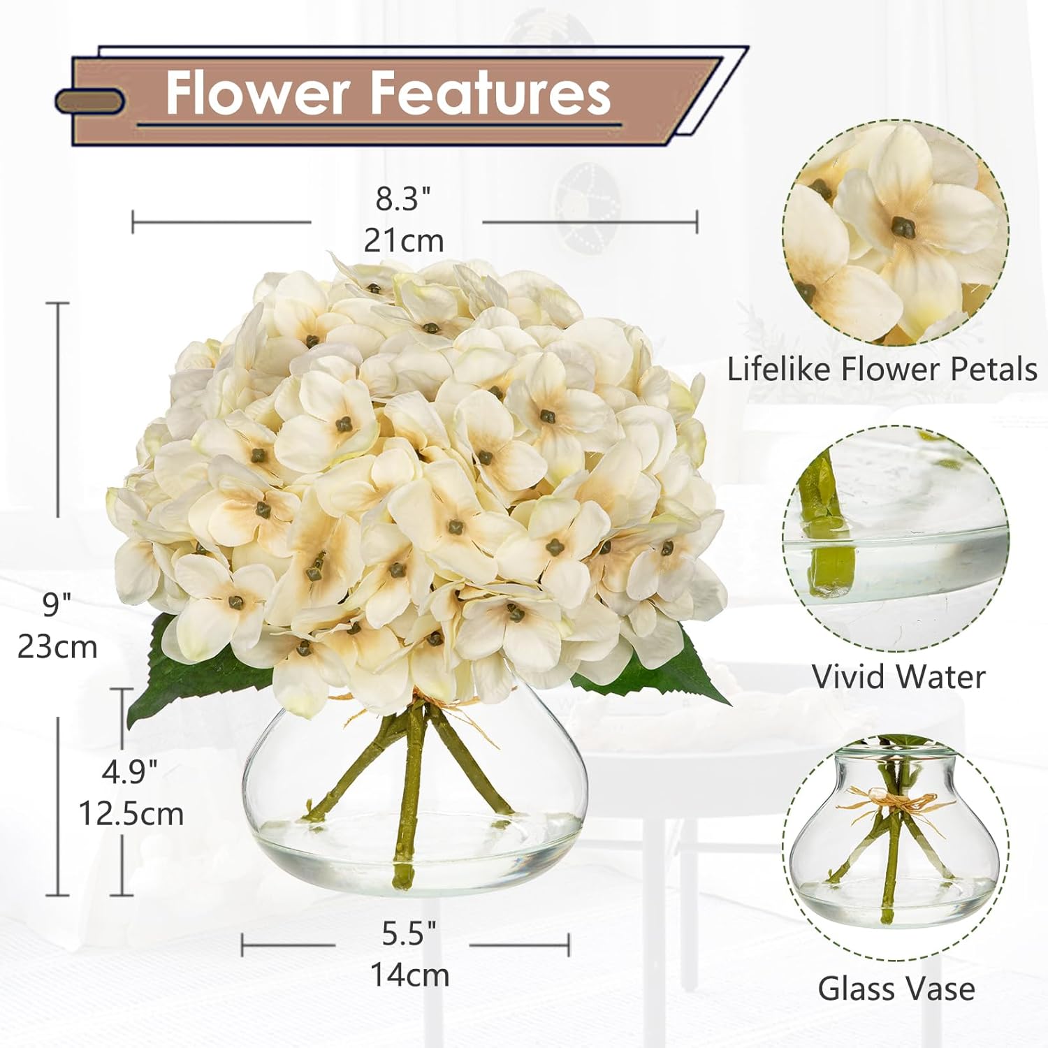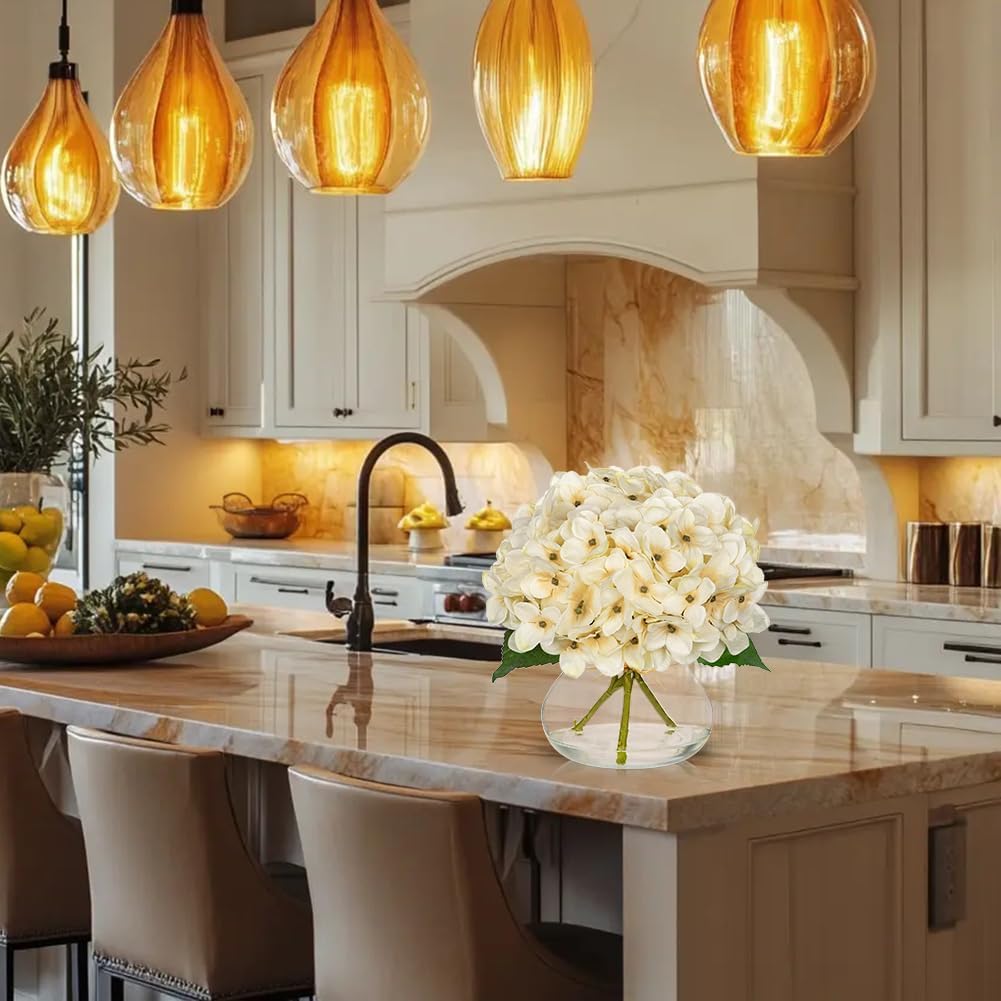 • 💐【Realistic & Elegant】Fall hydrangea artificial flowers for decoration with glass vase suits look so beautiful, unique craft design, brings different visual enjoyment to your home, create a romantic atmosphere, make you happy every day. Faux water on the vase adds to the pulchritude and realism. More realistic because of the details!