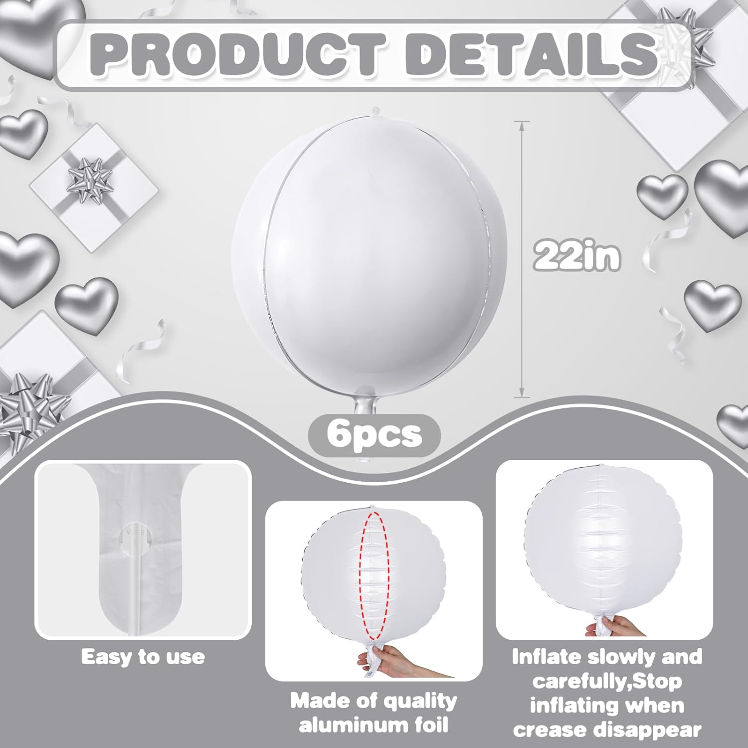 • 【6PCS ROUND BALLOONS】package include 6pcs 22inch white round giant 4D foil balloons. The white round balloons are large enough to help you better decorate your party.