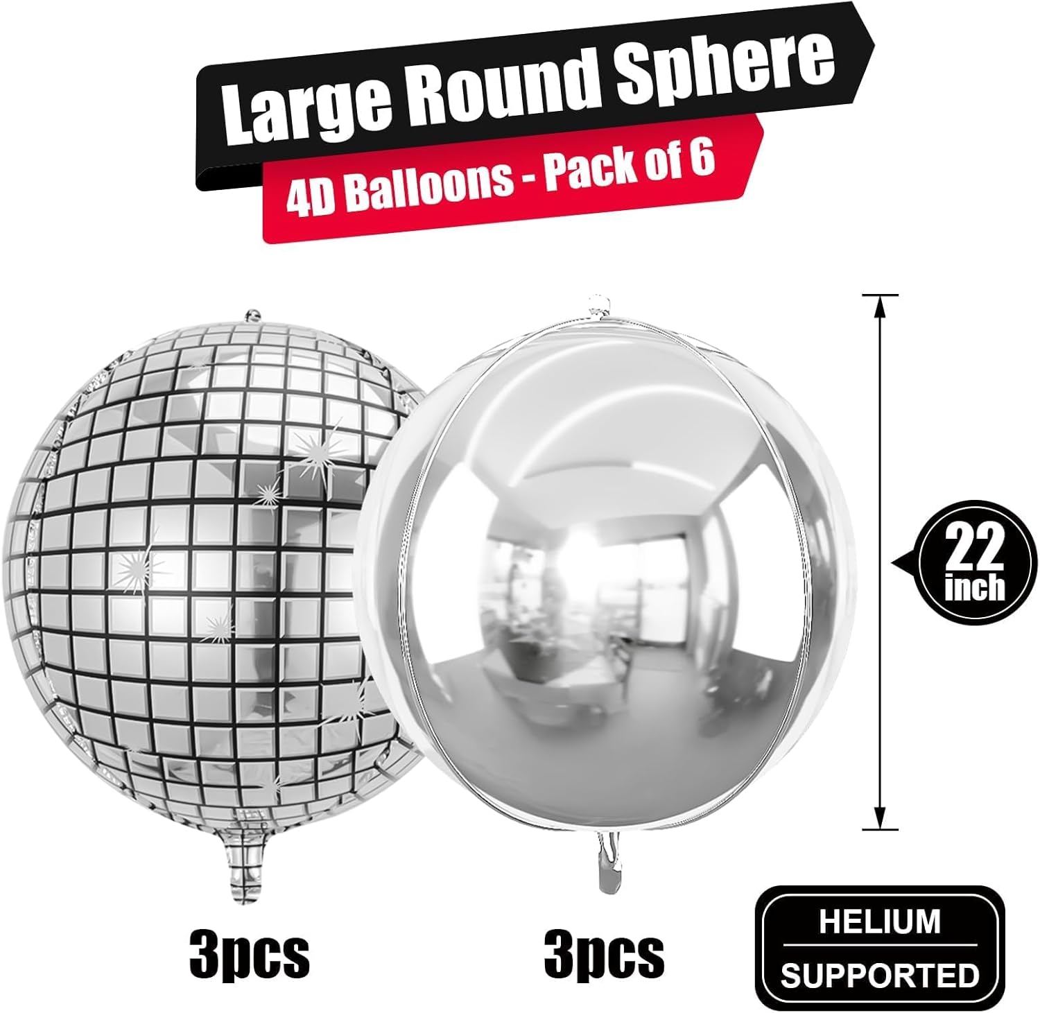 6Pcs 22 Inch Silver Balloons, Disco Ball Balloons with Silver Round Foil Balloon, 70s 80s 90s Theme Large Metallic Disco Balloon for Dance Bachelorette Graduation Birthday Party Supplies