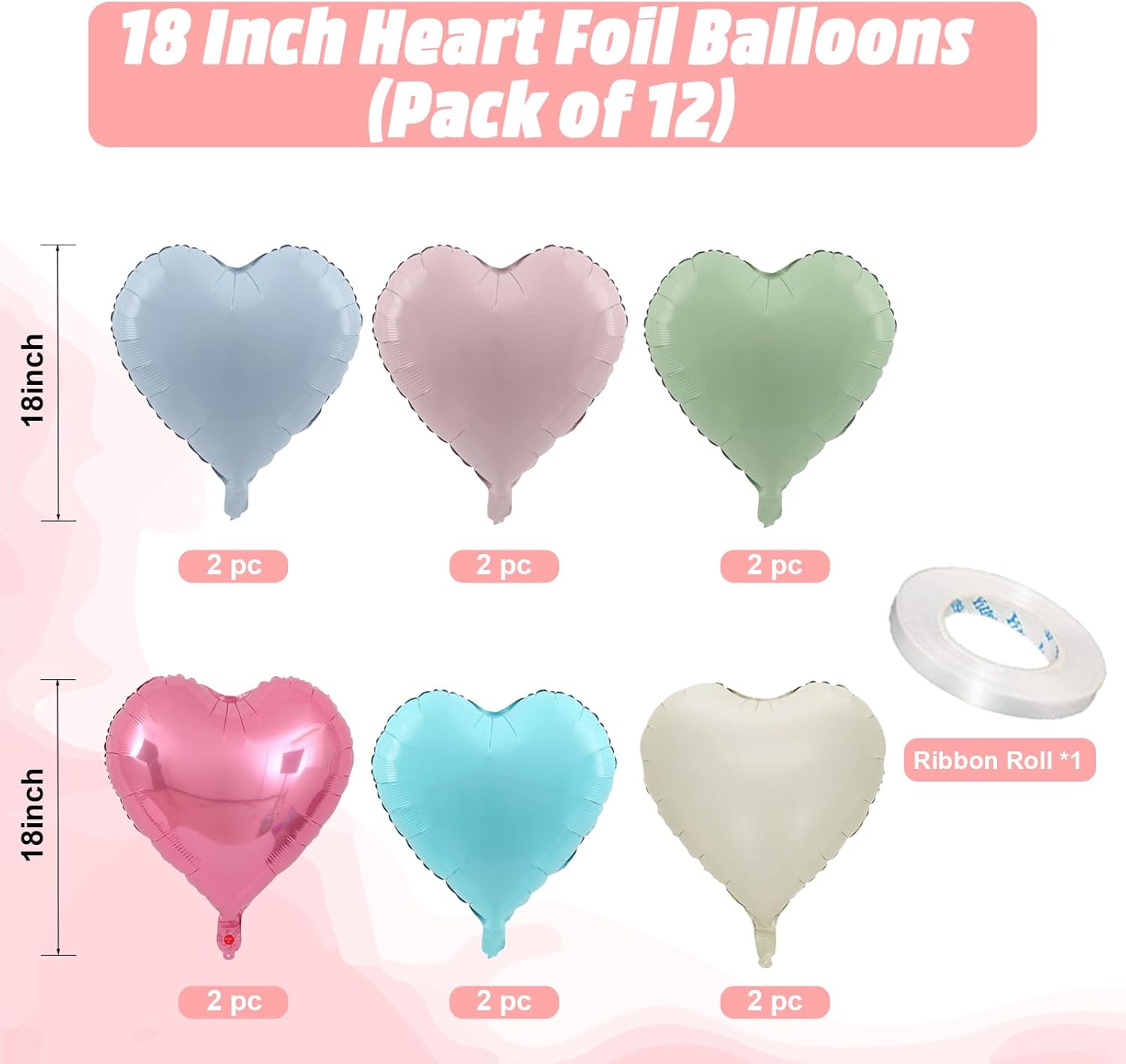 • Charming Pastel Colorful Heart Balloons: Elevate your celebration with our set of 12 heart-shaped rainbow balloons, each measuring 18 inches. Accompanied by a ribbon, these balloons are ideal for creating a festive and loving atmosphere at any special event.