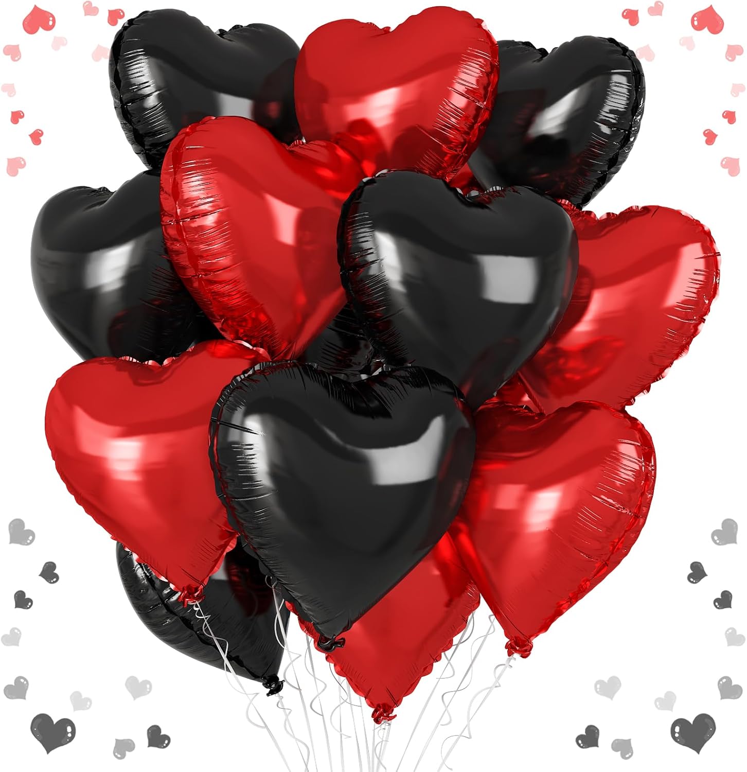 • Charming Red Black Heart Balloons: Elevate your celebration with our set of 12 heart-shaped red and black balloons, each measuring 18 inches. Accompanied by a ribbon, these balloons are ideal for creating a festive and loving atmosphere at any special event.