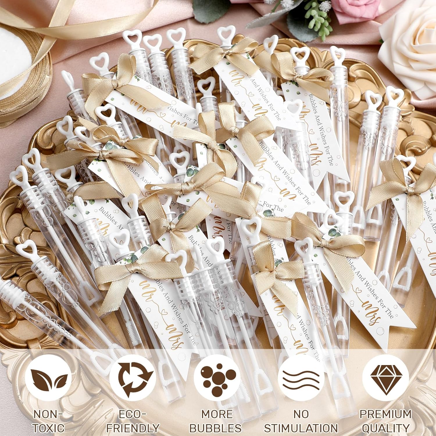 • Wedding Send off Bubbles: the wedding bubbles set contains 200 white heart mini bubble wands, 200 gift tags, 1 bubble send off display card, 1 wood color photo frame and 3 rolls of champagne gold ribbon, nice for wedding party favors and wedding farewell bubbles