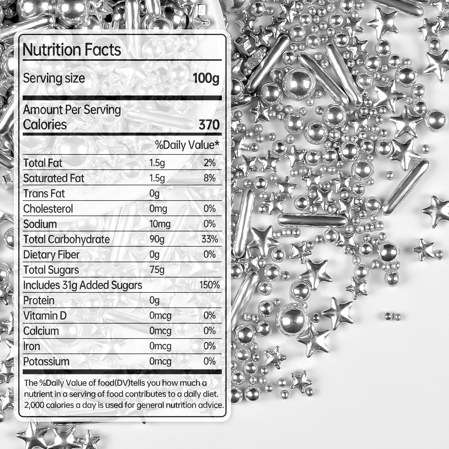 • Silver Pearl Rods Star Sprinkles are made up of pearl rods with mixed sizes and charming star shapes.With a net weight of 150g/5.29oz, they are free from gluten, nuts, preservatives, dairy products, artificial chemicals, and genetically modified organisms.