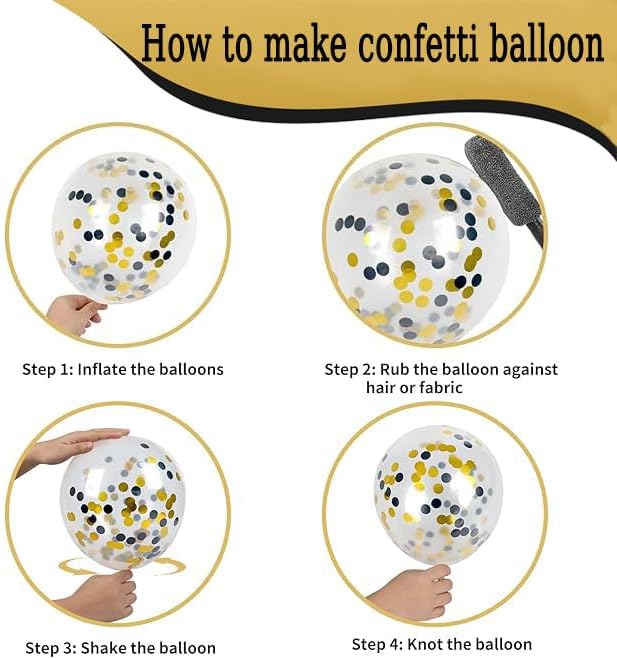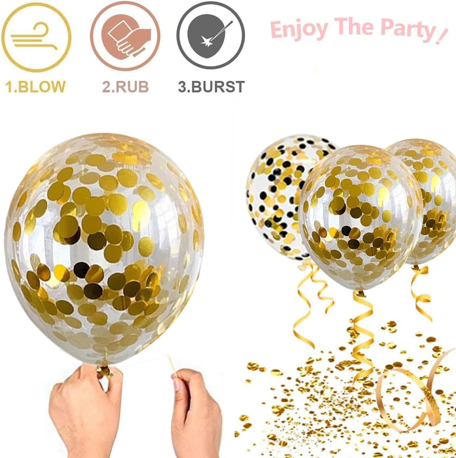 • 【Premium Value Pack】These gold and black balloons set includes:15pcs metallic gold balloons , 25pcs black latex balloons, 15pcs white balloons,5pcs gold confetti balloons,5pcs black and gold mixed confetti balloons,2 rolls of ribbon. All our party balloons are shipped in vacuum packaging to prevent them from being oxidized during transportation.