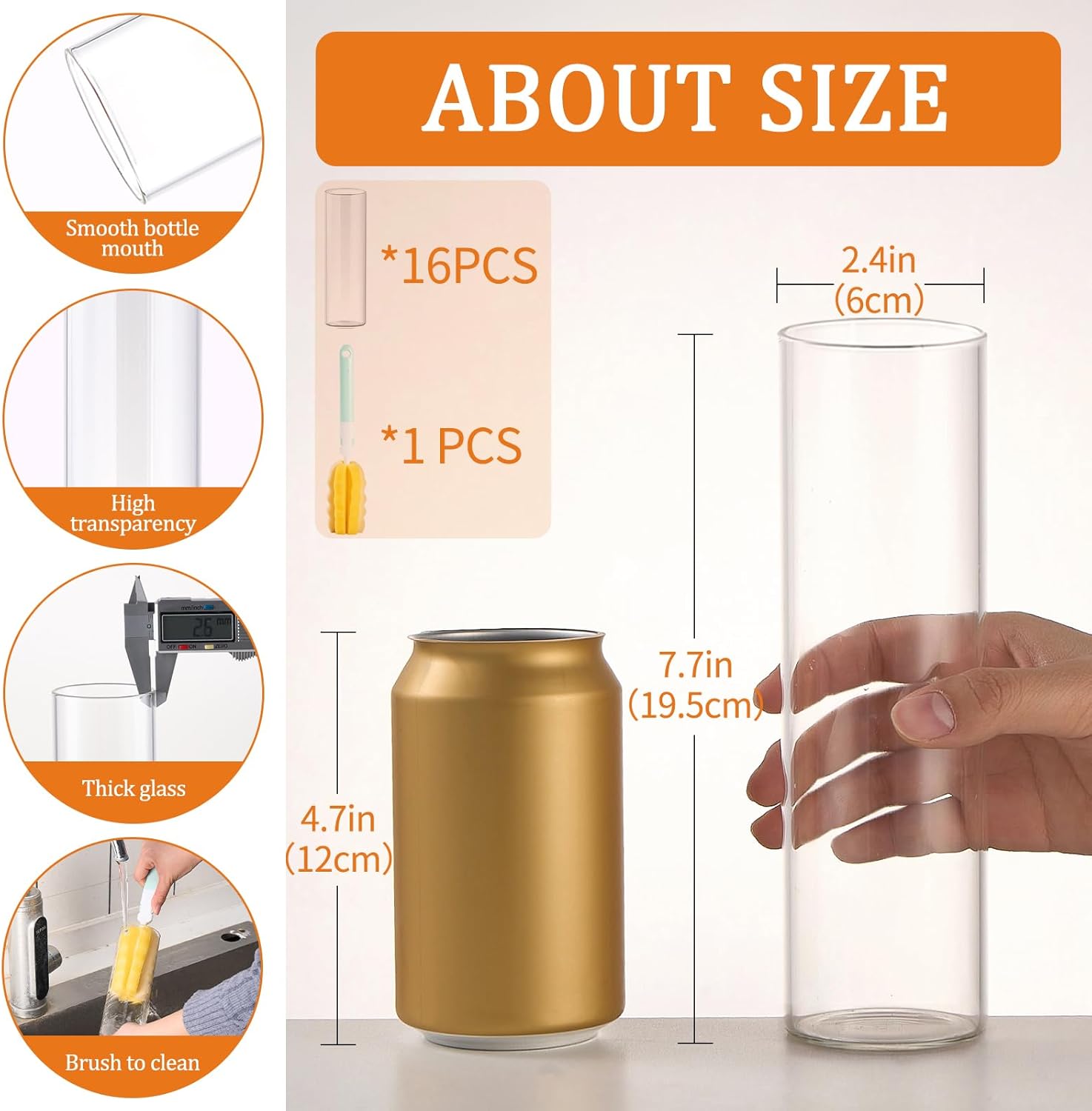 • 【PACKAGE INCLUDES】 16 clear glass bud vases measuring 2.4 inches in diameter and 7.7 inches in height, comes with a brush for cleaning the vases, ideal for parties, events, home decorations, table centerpieces, flower arrangements, floating candlesticks.