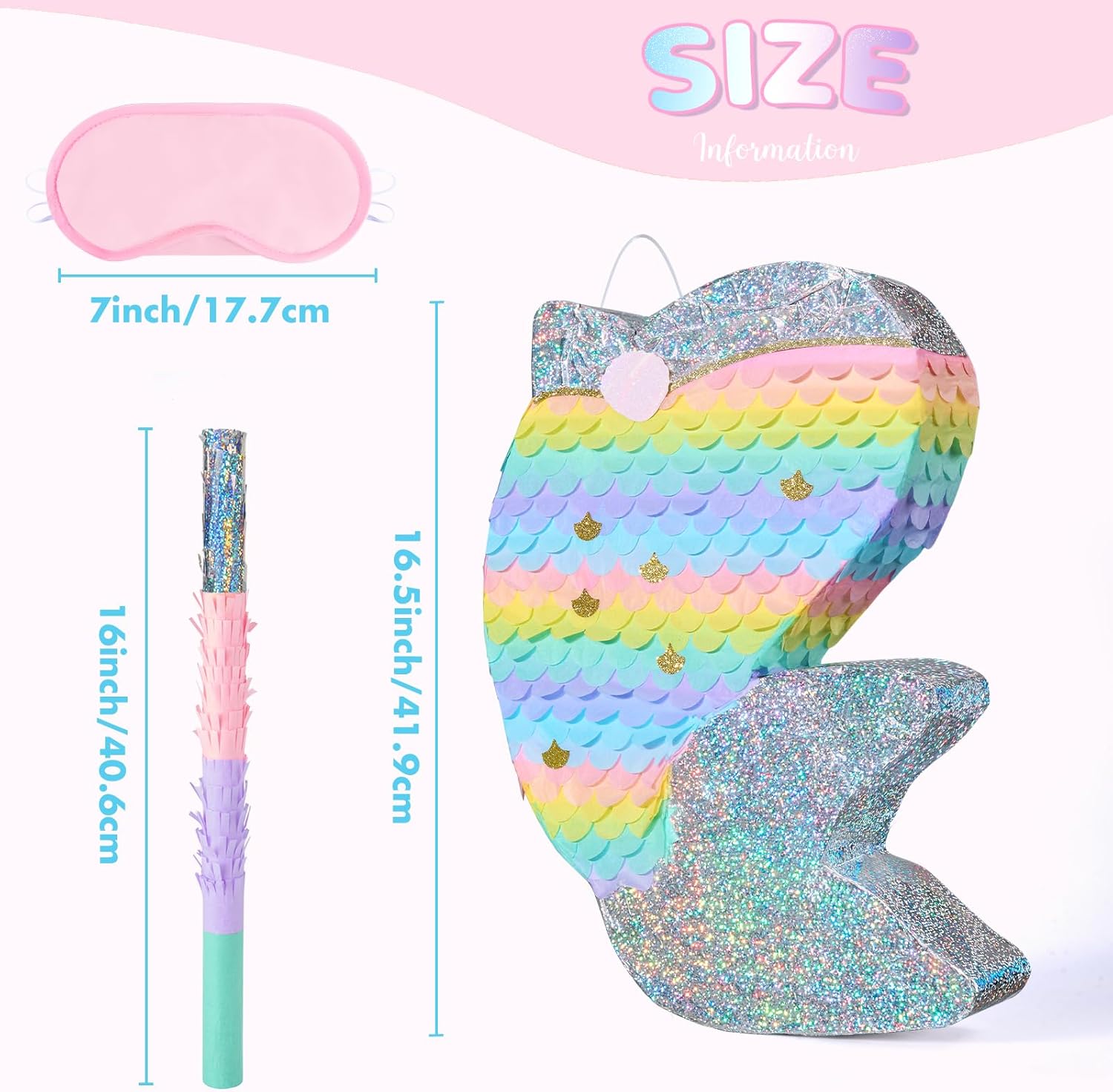 • PACKAGE INCLUDES - Glitter Mermaid Party Supplies Set Includes: 1 mermaid piñata , 1 eye mask, 1 piñata stick, and 1 sticker sheet. With our party supplies, you can easily enjoy a fun-filled game without the extra preparation!
