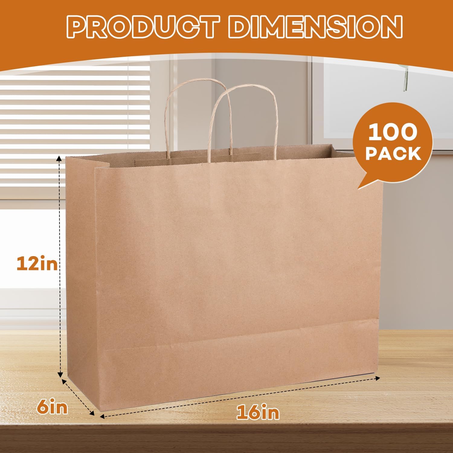• ECO-FRIENDLY LARGE BROWN PAPER BAGS - 100 pack 16x6x12 inches sturdy and durable brown bags are made of premium quality kraft paper and have well structured paper twisted handles.