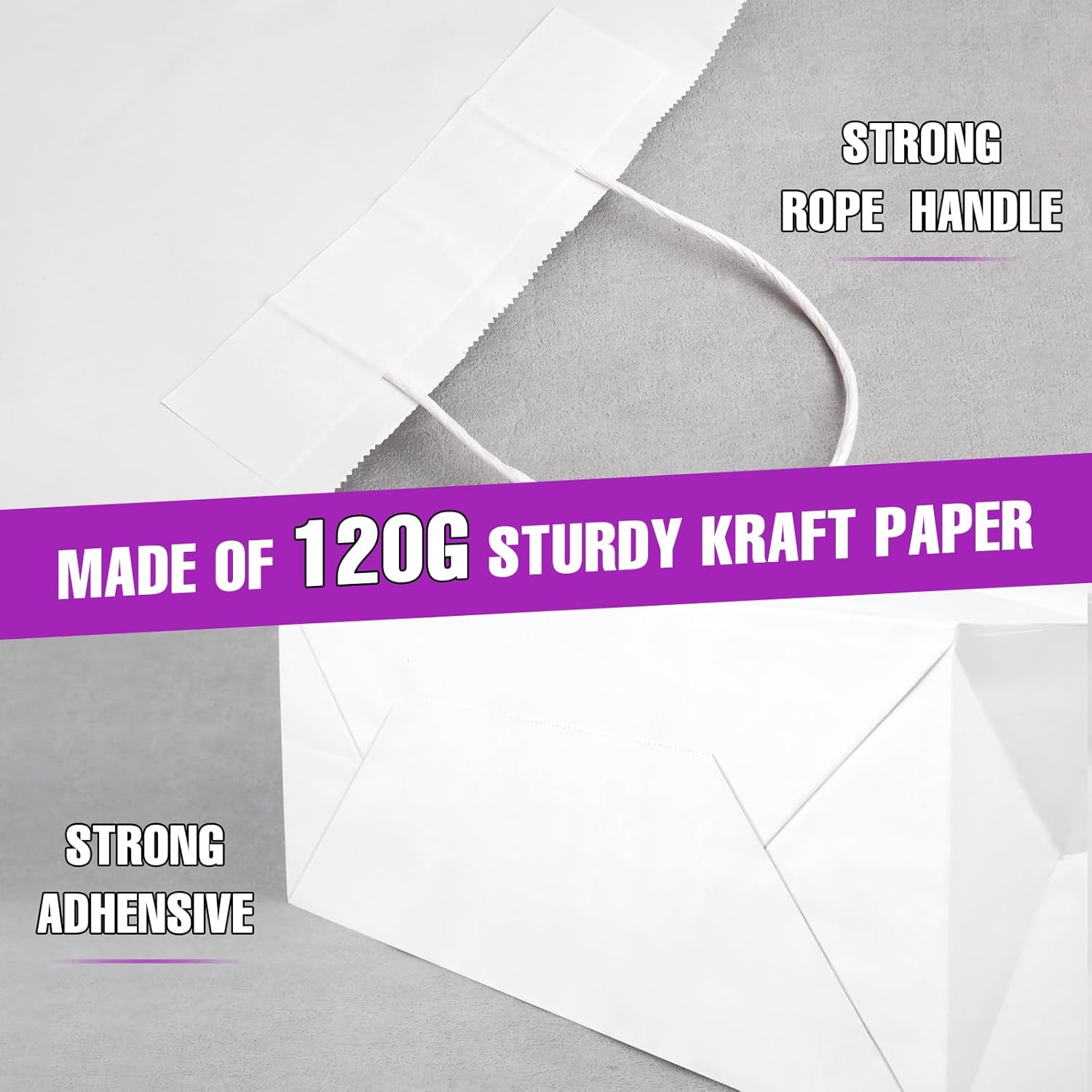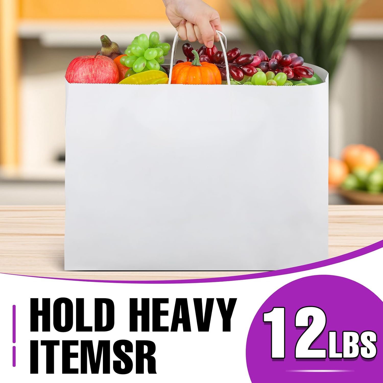 • ECO-FRIENDLY LARGE WHITE PAPER BAGS - 100 pack 16x6x12 inches sturdy and durable white bags are made of premium quality kraft paper and have well structured paper twisted handles.