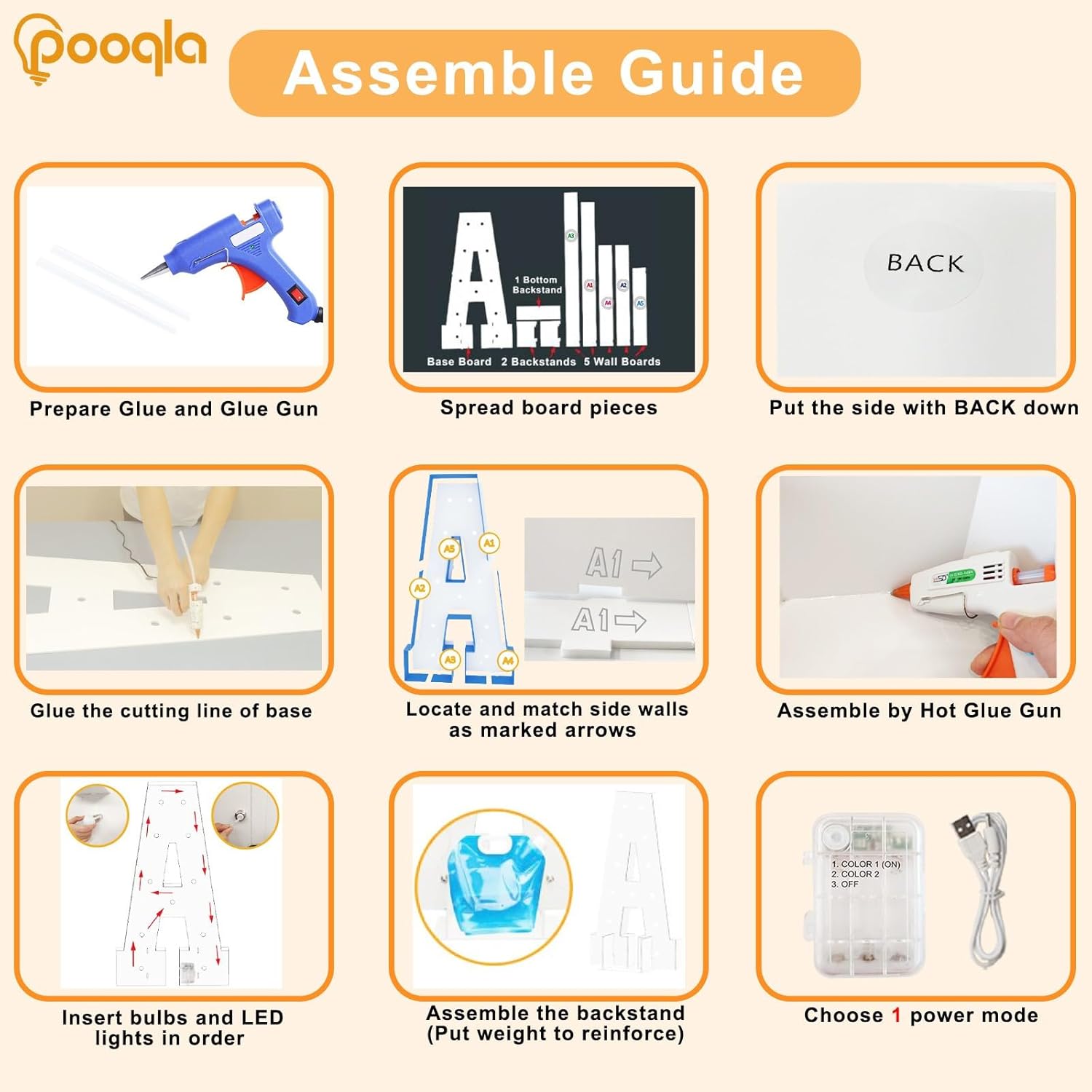 • Easy to Assemble: 1) Glue the base board, match the base and wall boards according to marked number and arrow. 2) Glue the base and wall boards together. 3) Screw the bulbs, connect LED lights and power on. Note: Glue gun, glue not included