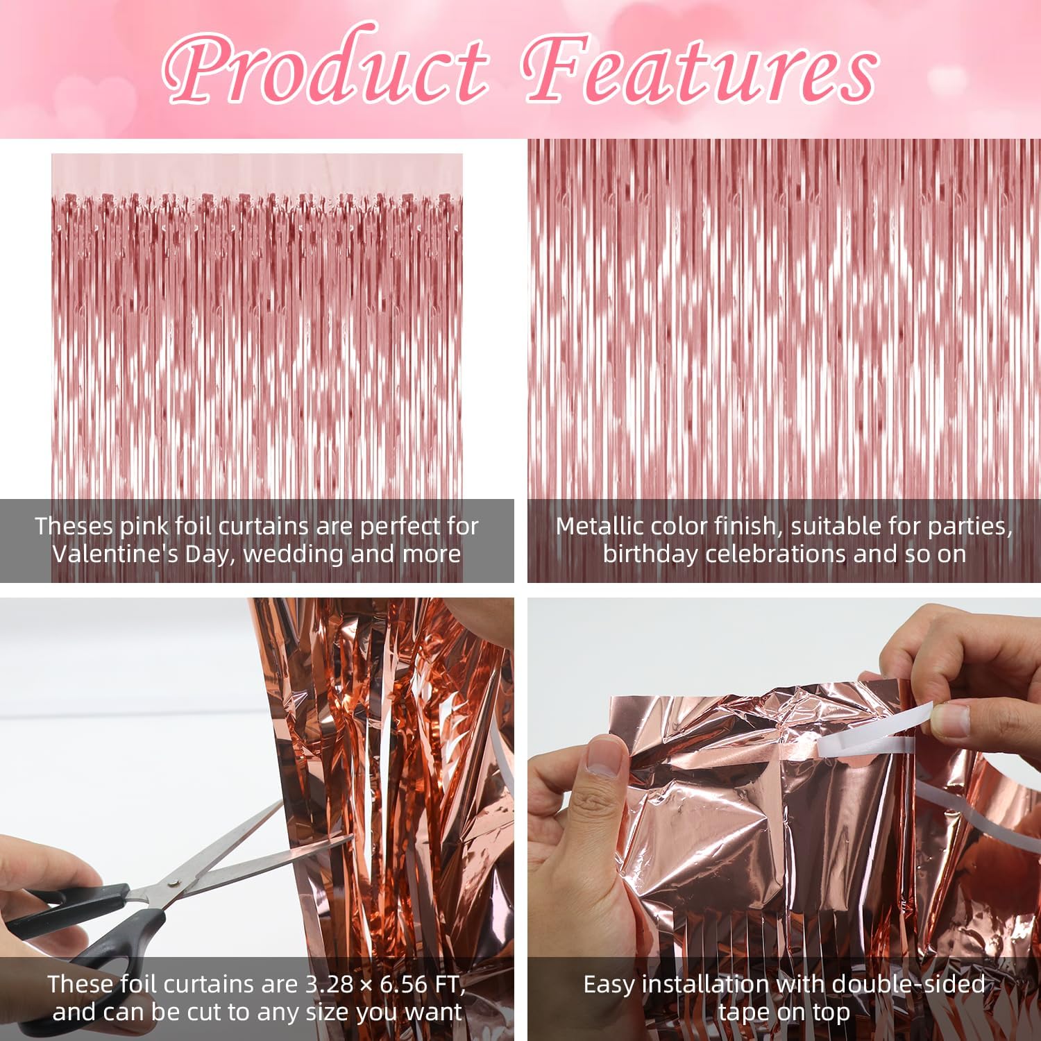 • Rose Gold Birthday Backdrop๏ผš5 packs of foil fringe curtains, the size of the foil curtain is 3.28 ft x 6.56 ft.It's long enough to fit any occasion. Please do not stick the foil curtain on uneven or stained walls to prevent it from falling off.