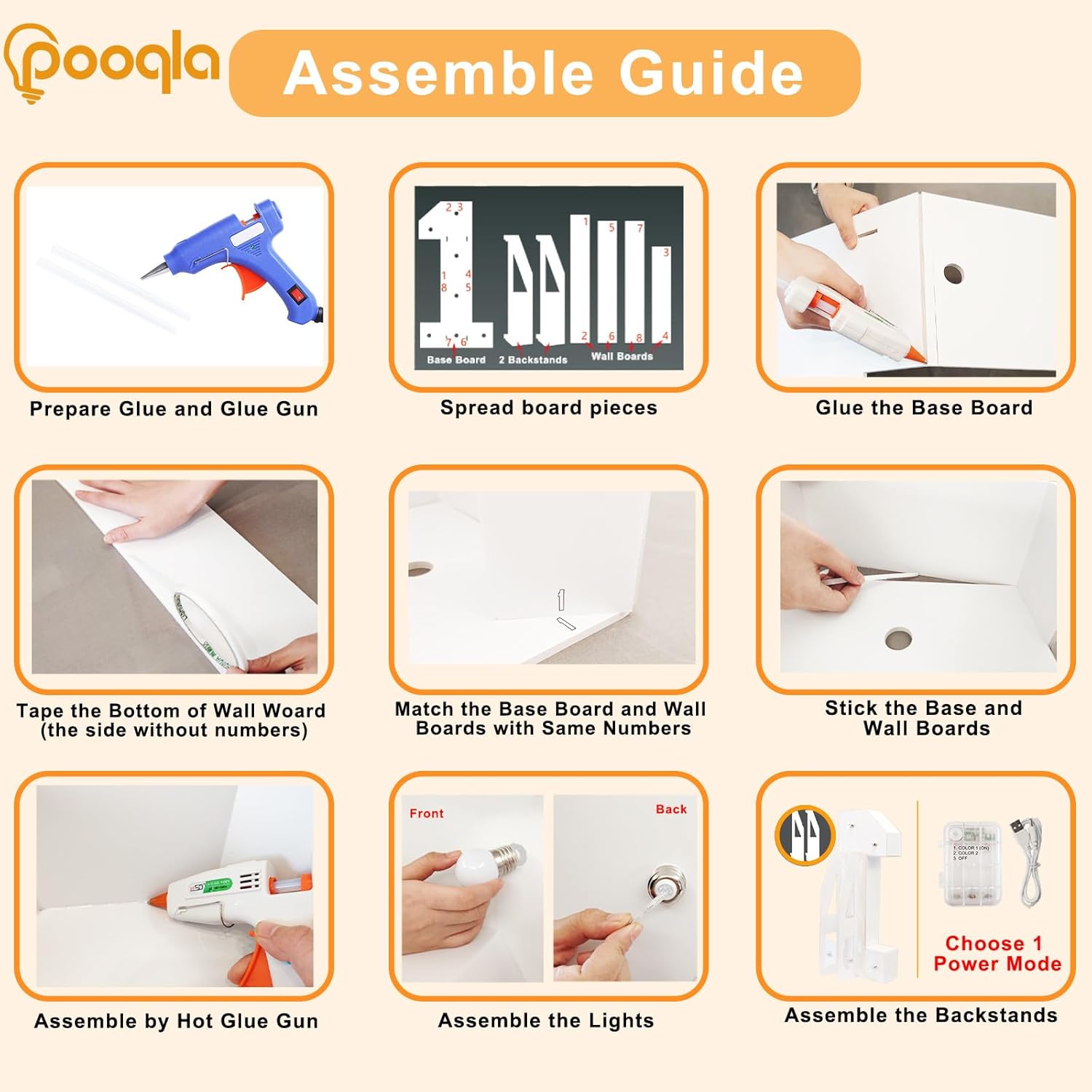 • Easy Assembling Procedure: Pre-cut frame marquee numbers are easy to set up: 1) Glue the base board and match the base board and wall boards according to same number. 2) Glue the base board and wall boards together. 3) Screw the bulbs into the board, connect LED lights and power on. (Noted: Glue gun, glue and batteries are not included) Let the installed marquee numbers light up every scene you need