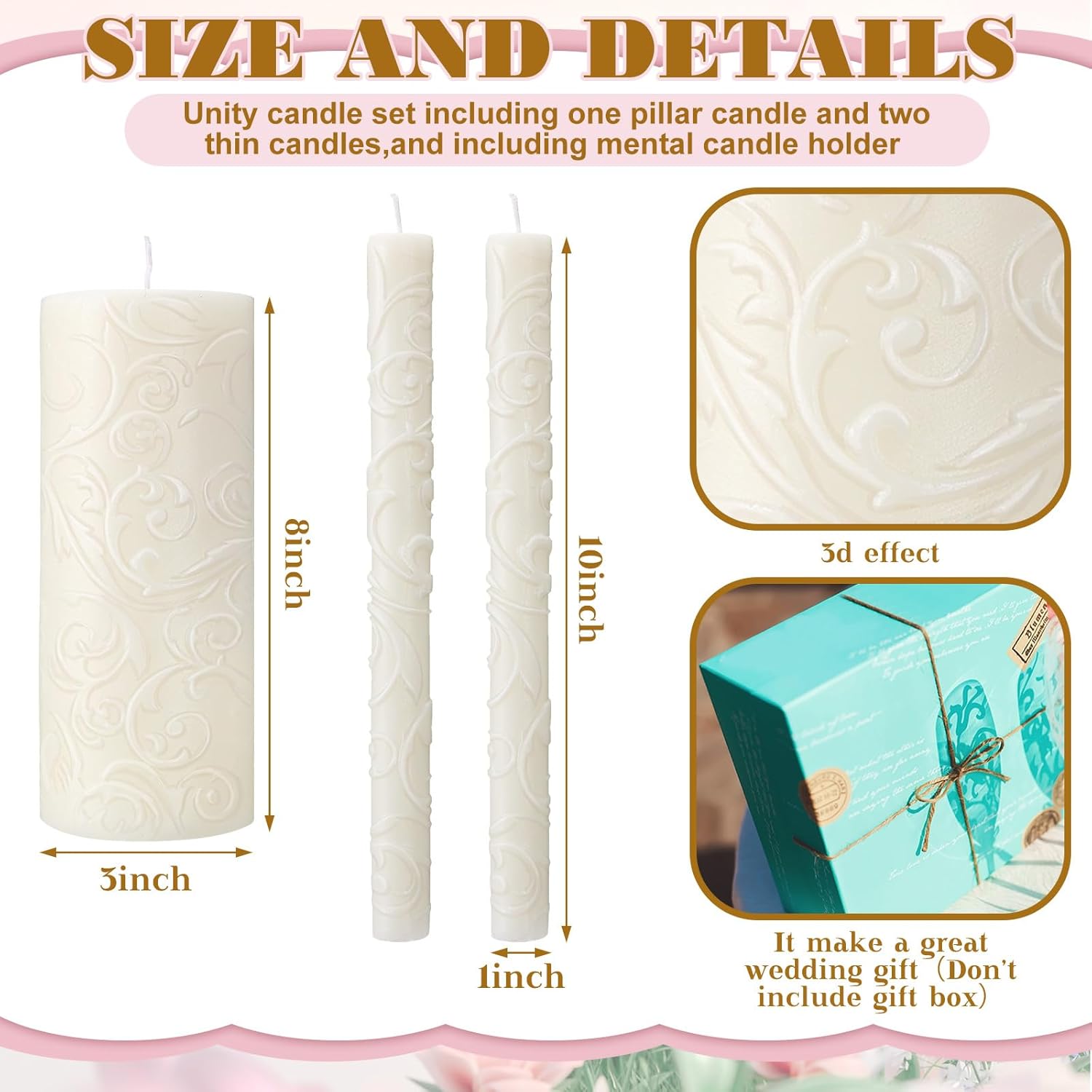 • Elegant Decor: the unity candle set with stand is exquisitely designed for wedding ceremony and home decor, elegant and stylish, will be an ideal way to decorate your living room, bedroom, bathroom, dining room as a table centerpiece, suitable for celebrations, anniversaries, housewarming and so on