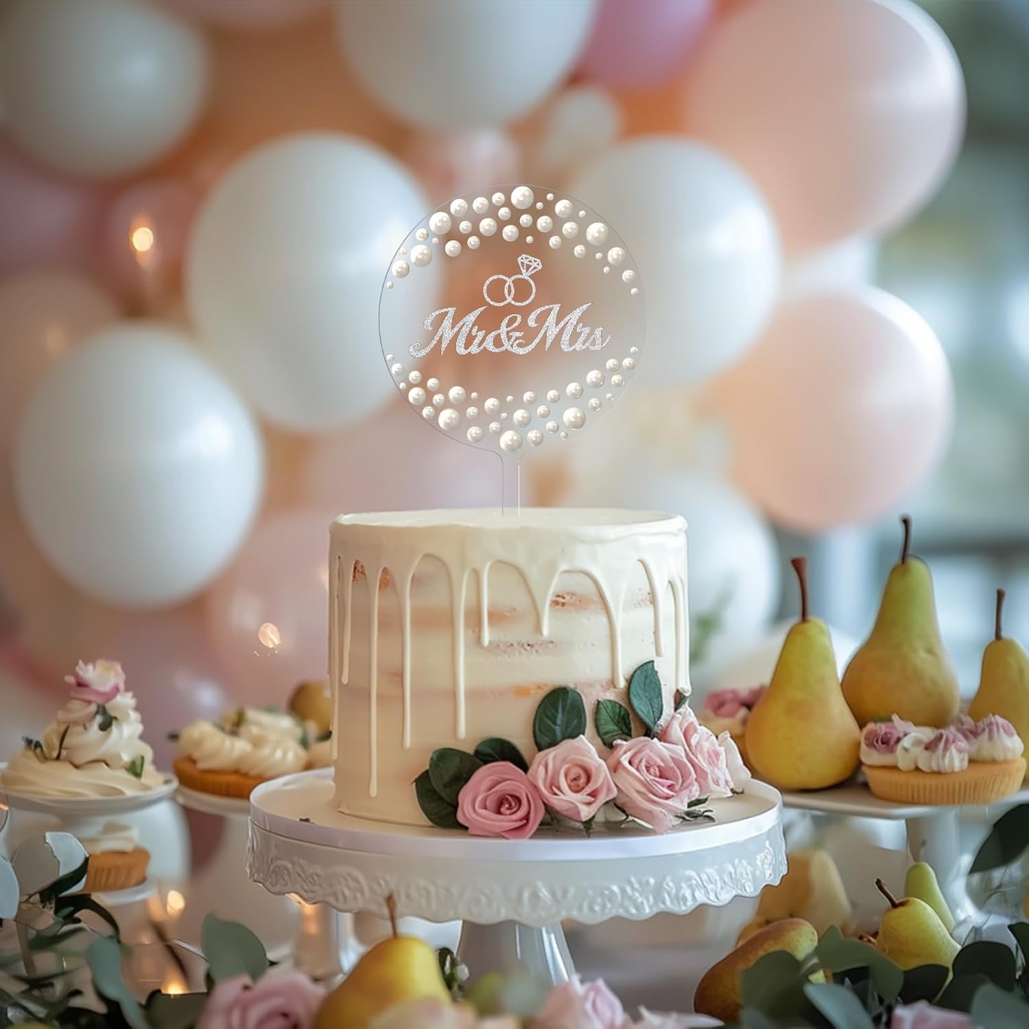 Mr & Mrs Wedding Cake Topper, Contemporary Bride and Groom Sign Rustic Resin Décor for Engagement & Anniversary, Bridal Shower & Party Celebrations (Transparent acrylic & Pearl)