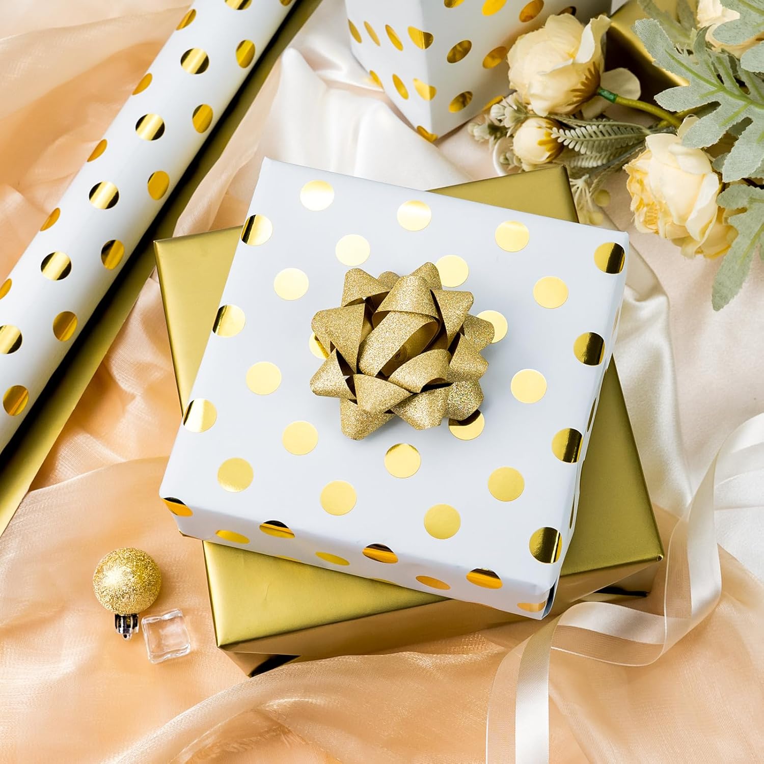 • Double-Sided Wrapping Paper: One side features white and gold polka dots, while the other is solid gold, adding a touch of sophistication