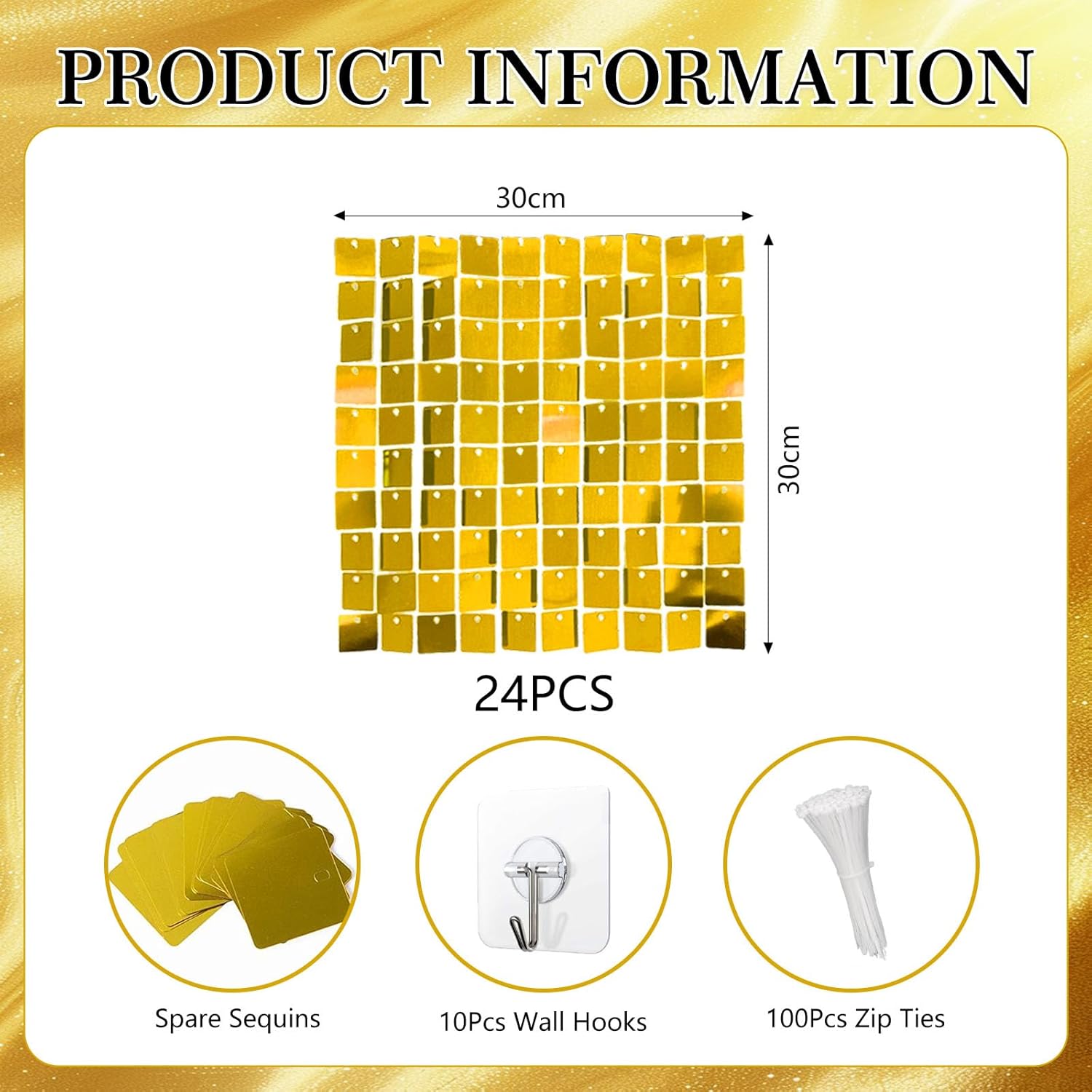 24PCS Gold Shimmer Wall Backdrop, Square Sequin Backdrops Panel, Glitter Wall Background for Birthdays, Weddings, Graduation, Engagements, Disco Bachelorette Party Decoration (4FTx6FT)