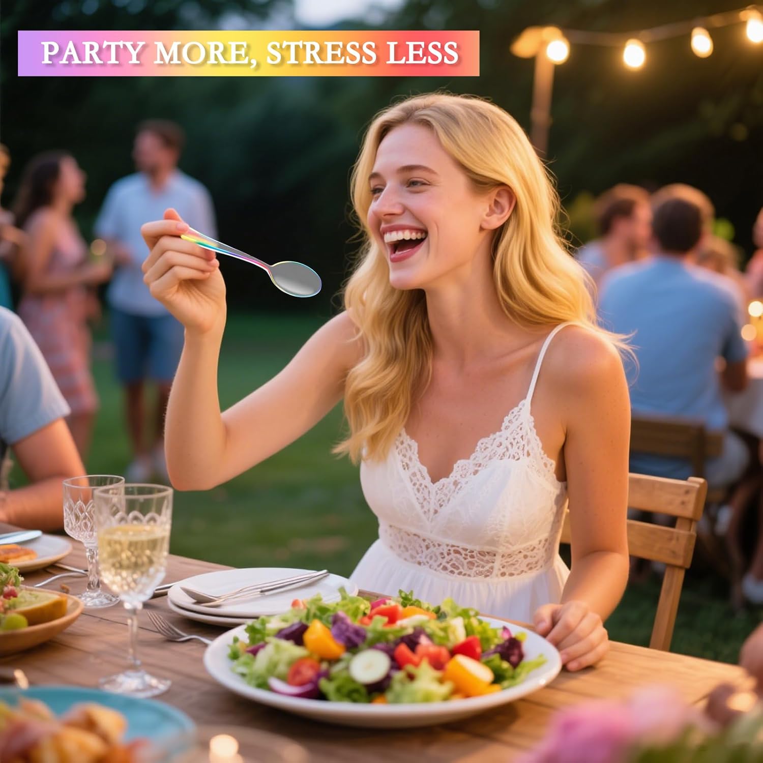 • Quality and Timely After-Sales Service: Backed by certification and strict quality control, our plastic cutlery set guarantees durability and consistency across every piece. We offer a 100% refund policy for damaged or missing items, ensuring your complete confidence in every purchase. Each rainbow silverware set withstand the rigors of large events while maintaining its stunning appearance.