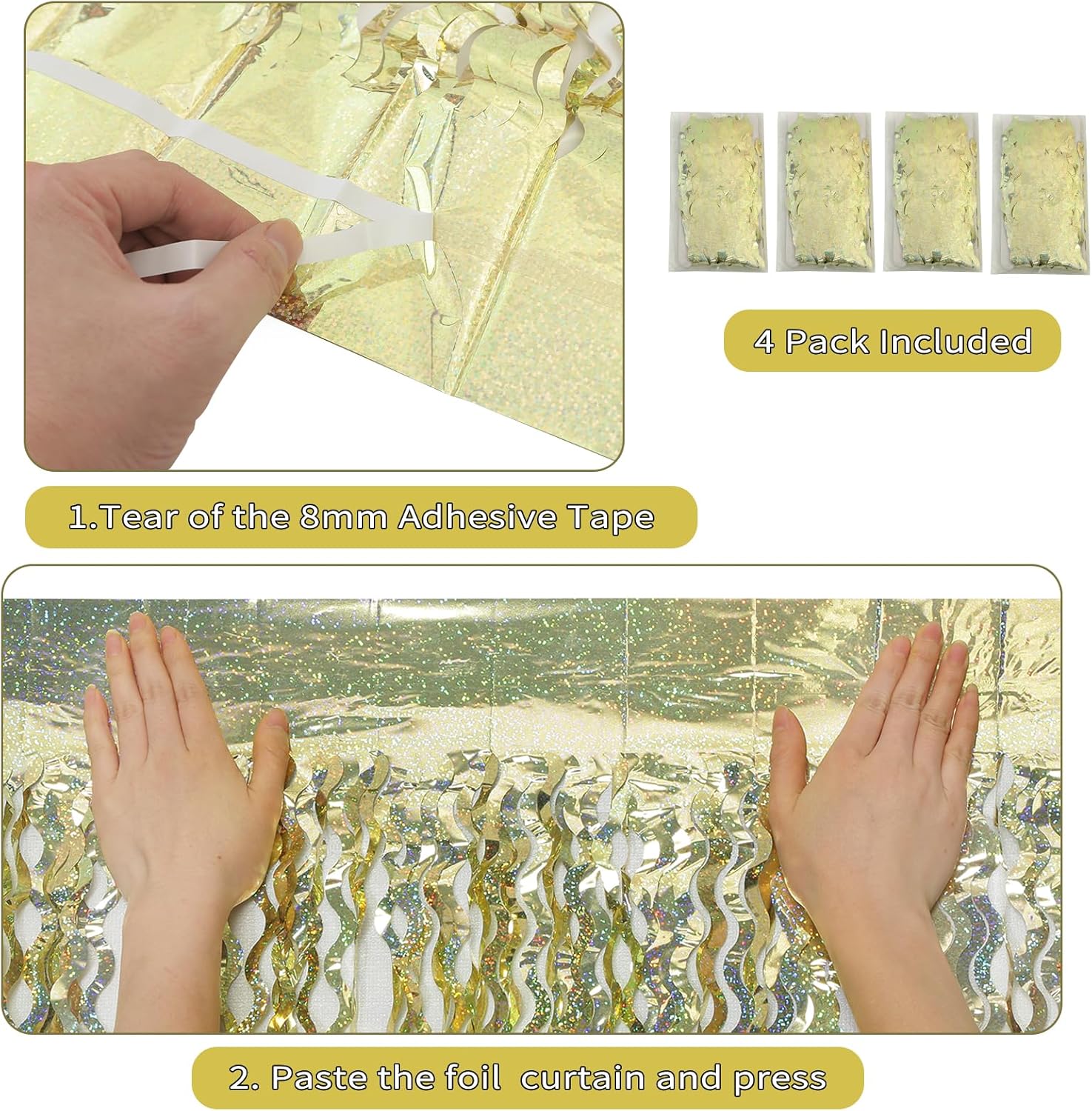 4 Pack Wavy Sparkle Champagne Gold Metallic Tinsel Foil Fringe Curtains Photo Booth Backdrop | Gold Streamer Backdrop for Holiday Celebration Bachelorette Party Decorations