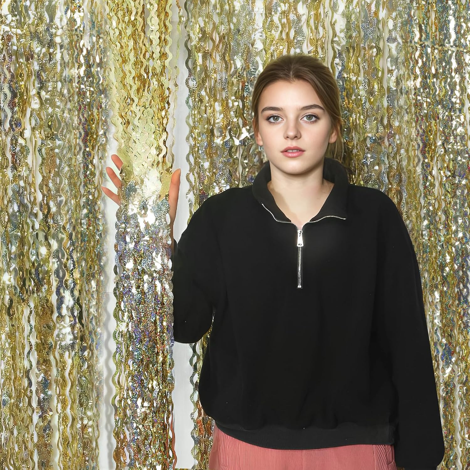 • Wavy Shape and Quality Material: The champagne gold metallic tinsel backdrop is made of aluminum foil with wavy shape,You can overlap or side by side the fringe backdrop make it more fuller and better look
