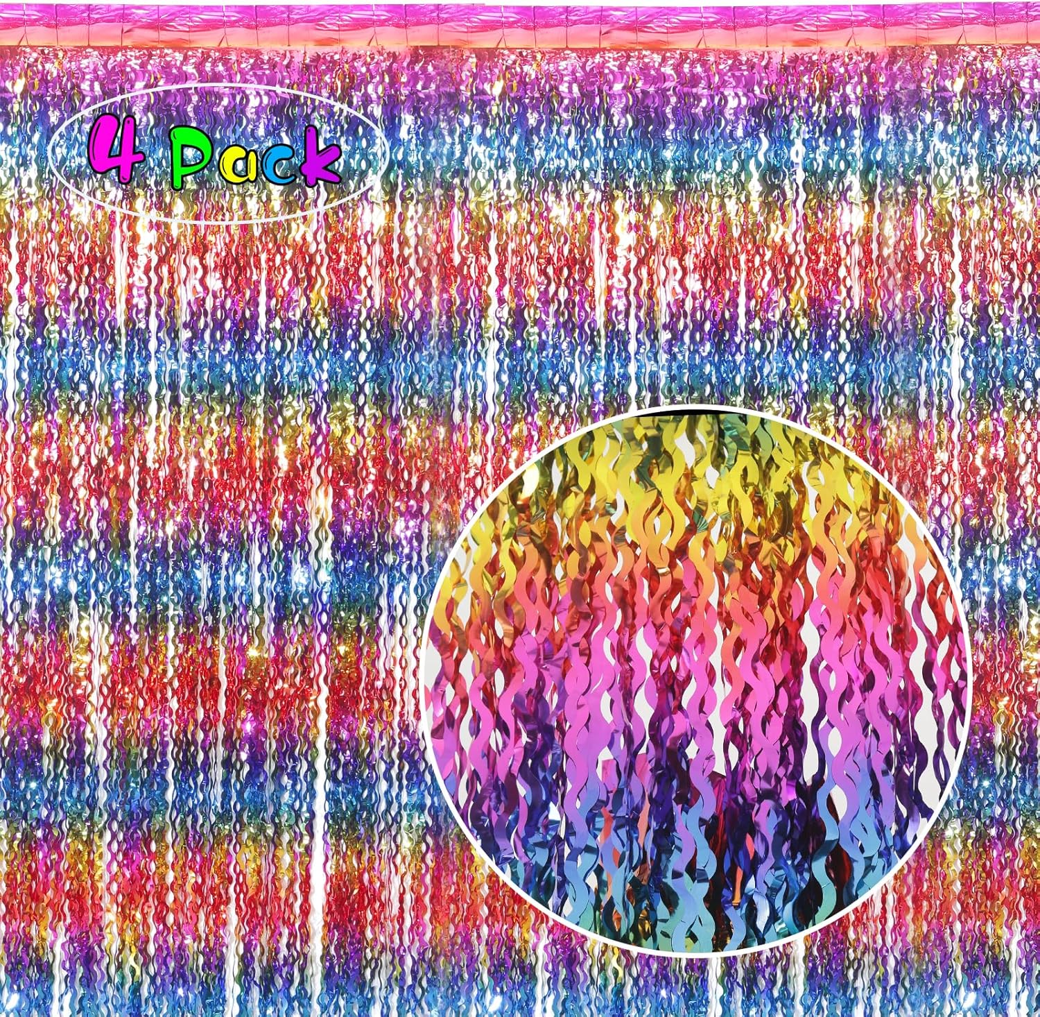 4 Pack Wavy Rainbow Foil Fringe Curtain | 3.3x6.6ft Colorful Tinsel Metallic Streamers Holiday Photo Booth Props Backdrop for Engagement Bridal Shower Unicorn Party Decorations