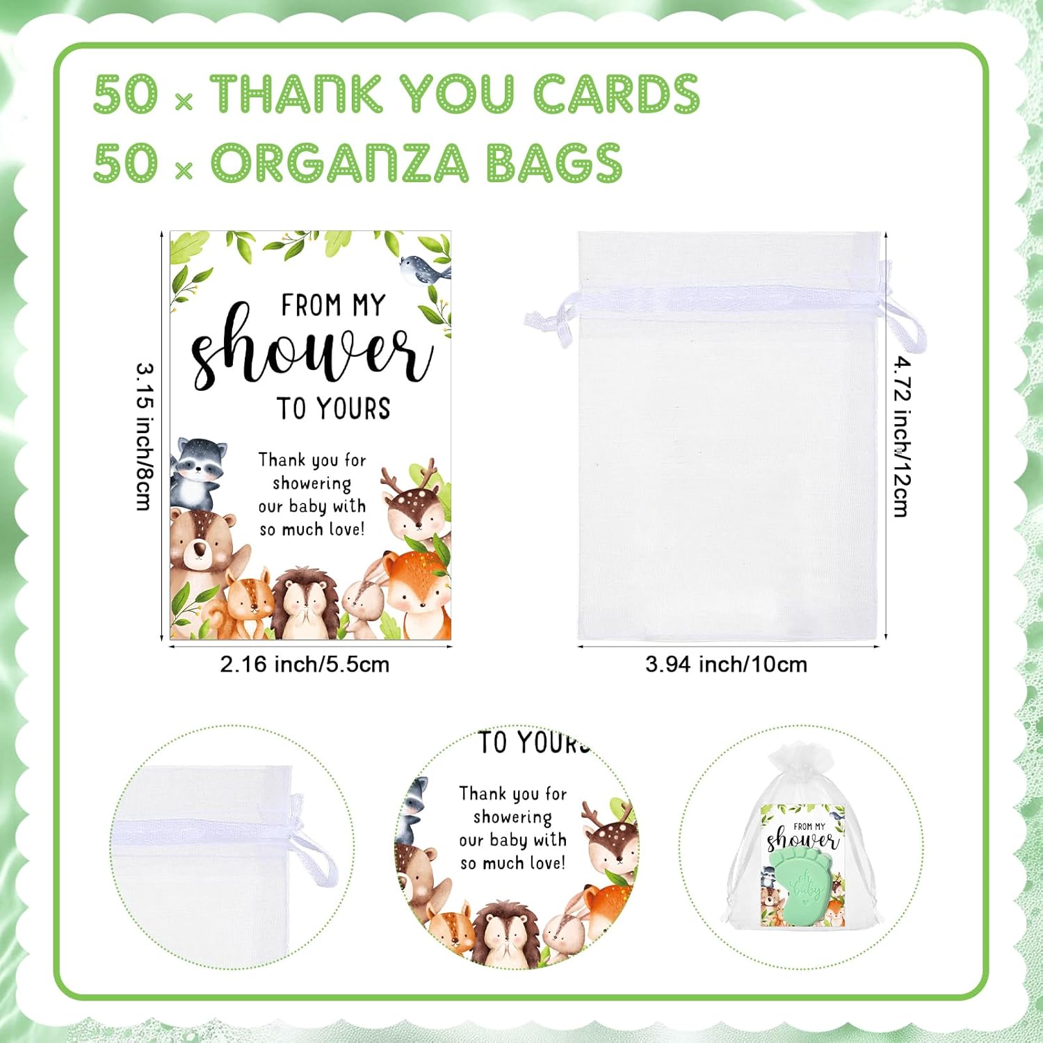 • Suitable Size: at a convenient size of 2.13 x 1.77 inches and 20 grams, our baby shower soaps are designed for easy handling and travel friendly; The thank you cards measure 2.17 x 3.15 inches, and the organza bags are 3.94 x 4.72 inches, each item perfectly sized for convenience and easy packing