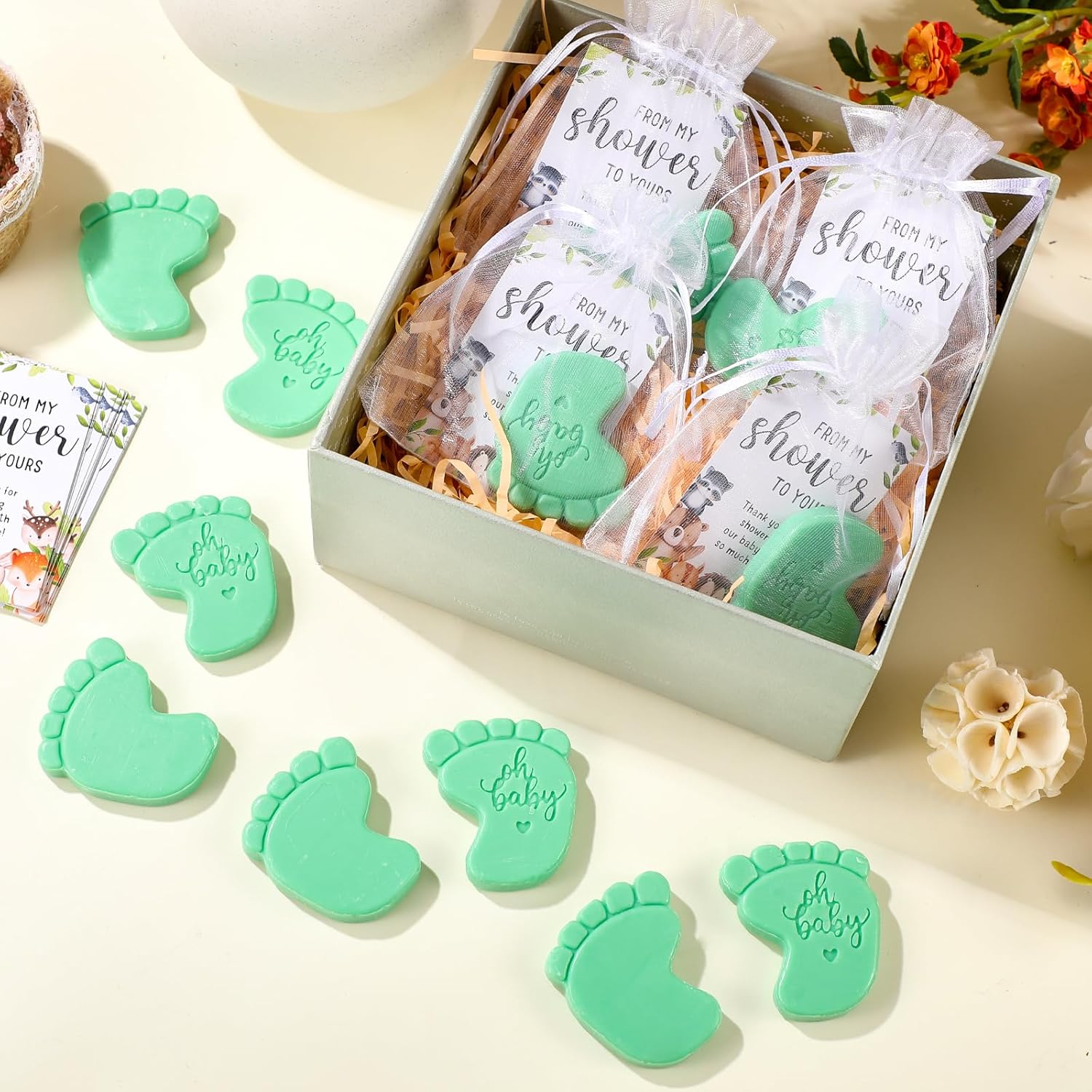 • Baby Shower Soaps: these baby shower soaps are made from natural vegetable oil soap base and glycerin, ensuring skin friendly and smooth usage; The package is a complete set containing 50 handmade soaps, 50 thank you cards, and 50 organza bags, making it a comprehensive and excellent gift choice for your guests