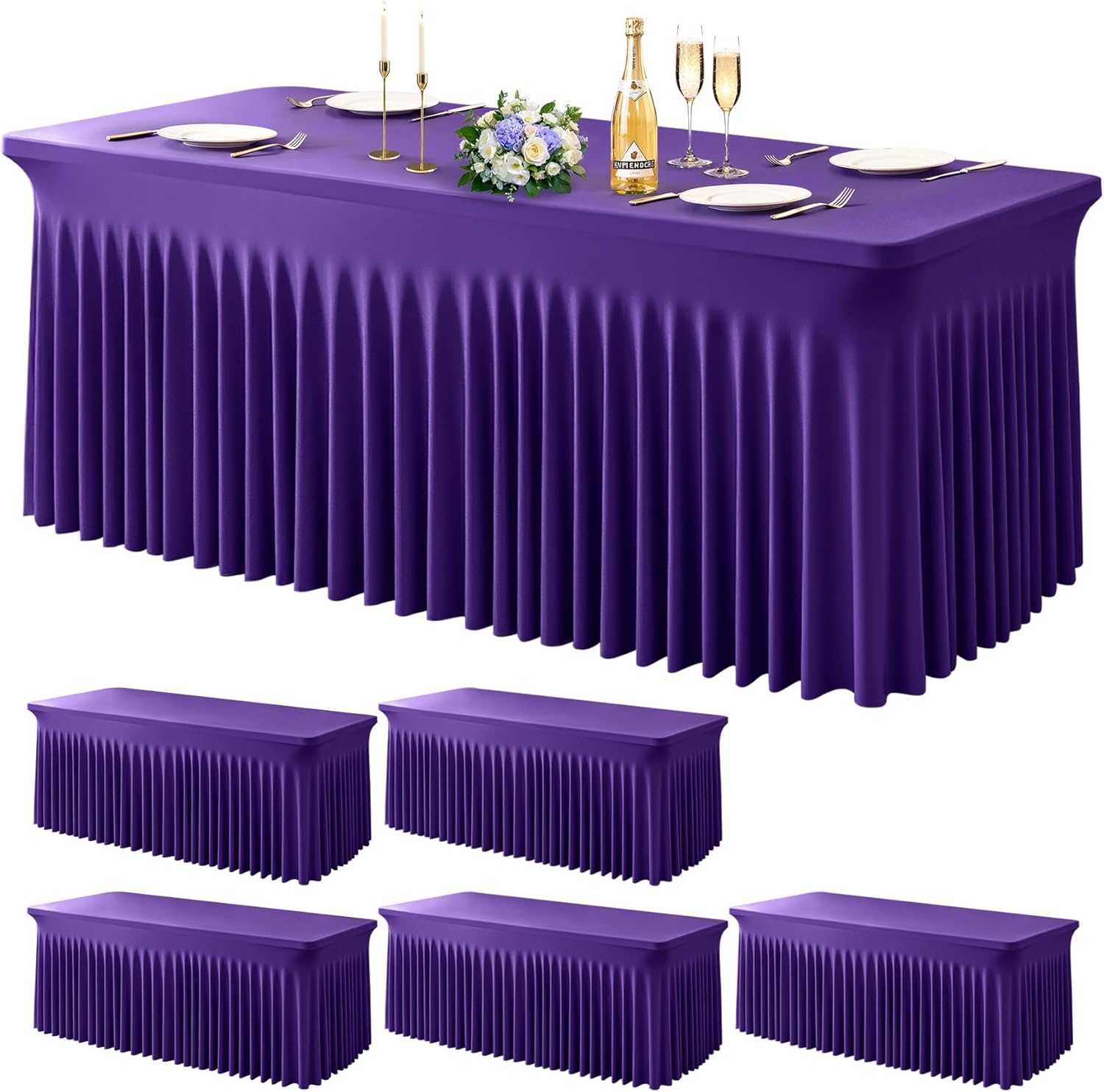 6 Pack Dark Purple Spandex Table Clothes for 8 Foot Rectangle Tables, 8FT Wrinkle Free Fitted Tablecloths Ruffles Design Table Cover for Party, Banquet, Wedding and Events