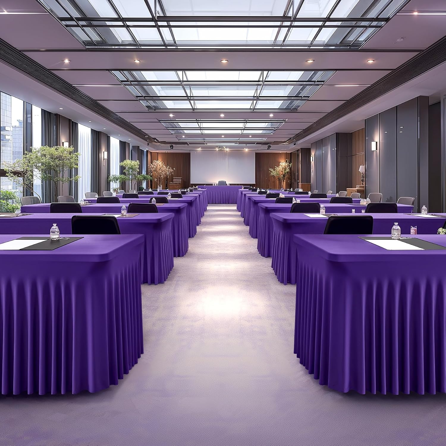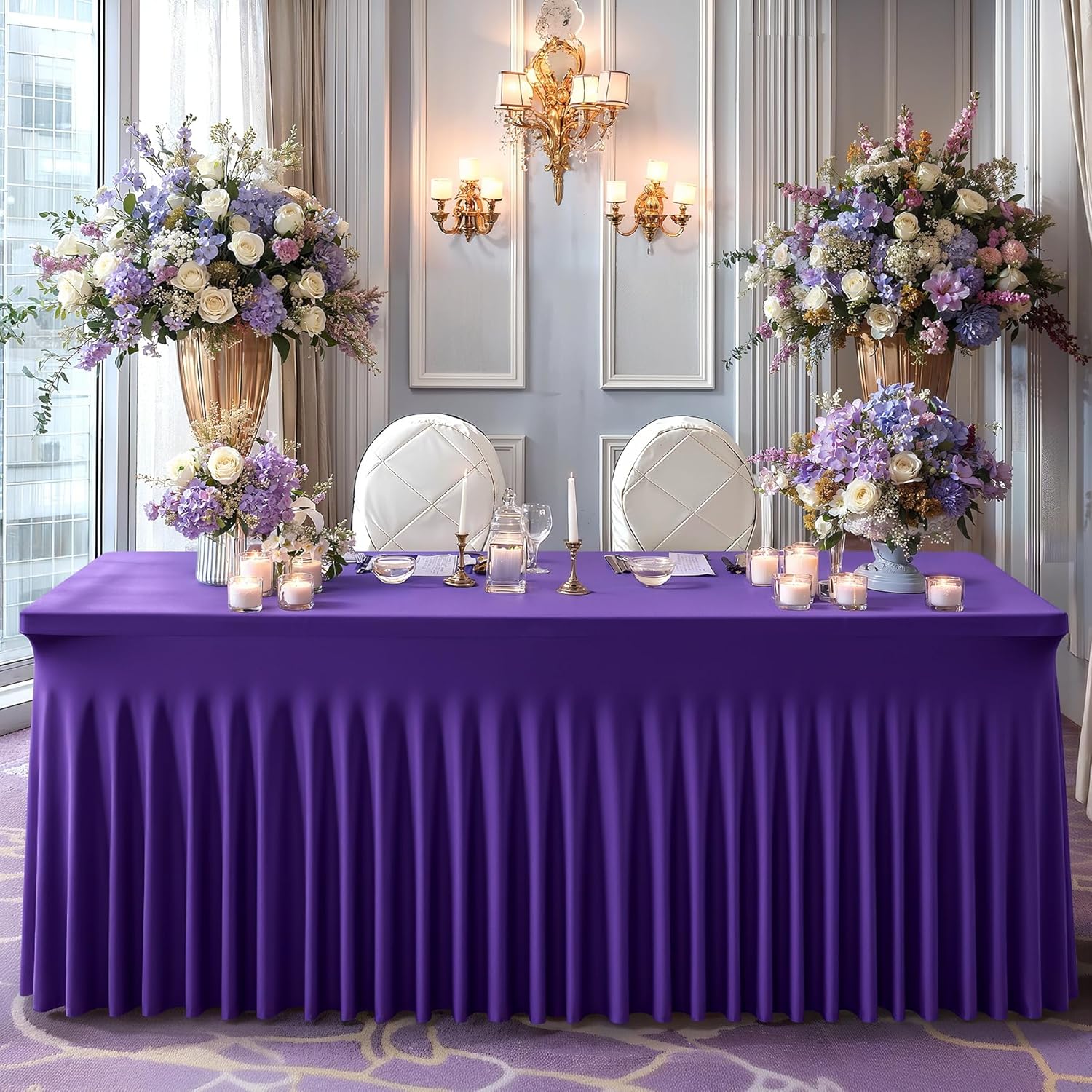 • 【Fitted Tablecloth Package】- 6 Piece Spandex Table Covers. Material: High Quality Wrinkle Free and Stretchy Fabric. Color: Dark Purple. Size: 96"L X 30"W X 29"H. Fitted for 8 foot rectangle tables. Change your table into a new look in few seconds with our tablecloths