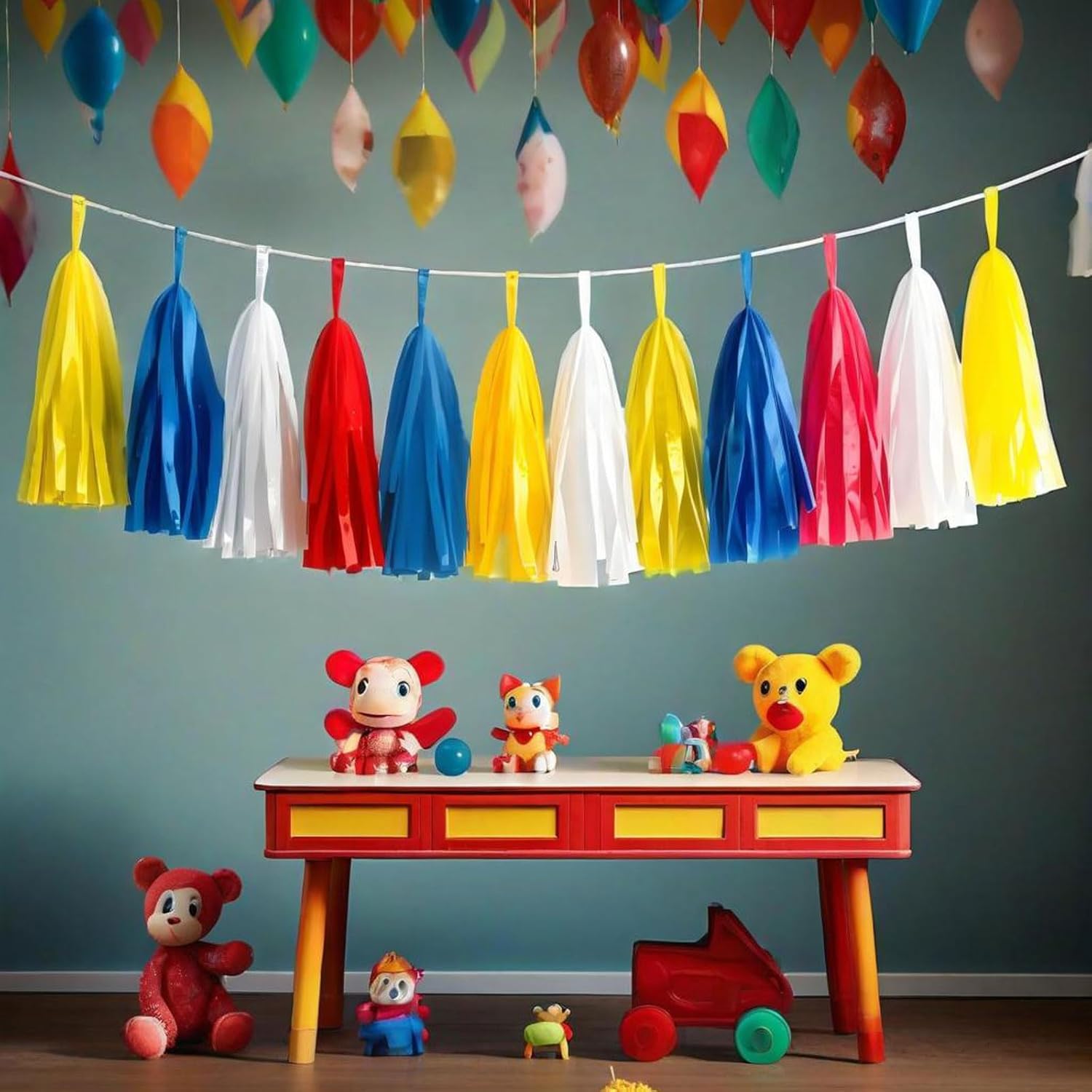 • PACKAGE CONTENTS: Set of 20 tissue paper tassels in red, blue, yellow, and white colors, pre-strung on a 6-foot twine for easy hanging and instant decoration