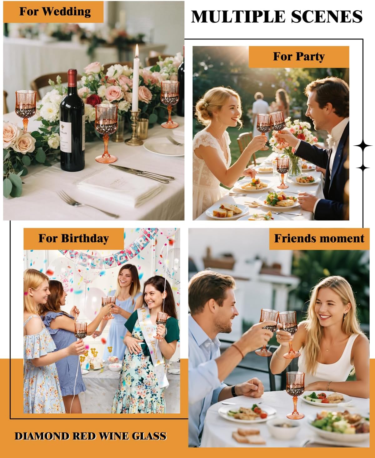 • Retro diamond-shaped pattern design: Imitating real crystal, plastic wine glasses have the charm of a vintage wine glass. Plastic wine glasses disposable’s retro design enriches the modern and classic dining table setting with an elegant atmosphere.