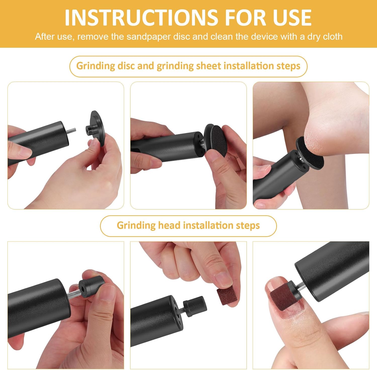 • Package Includes】:5.9-inch device × 1,USB charging cable × 1,Premium metal heads × 2 (Callus mode / Nail mode),80 grit for calluses ×10,120 grit for sensitive areas ×10,Ring sandpaper for nail polishing × 10,User manual × 1