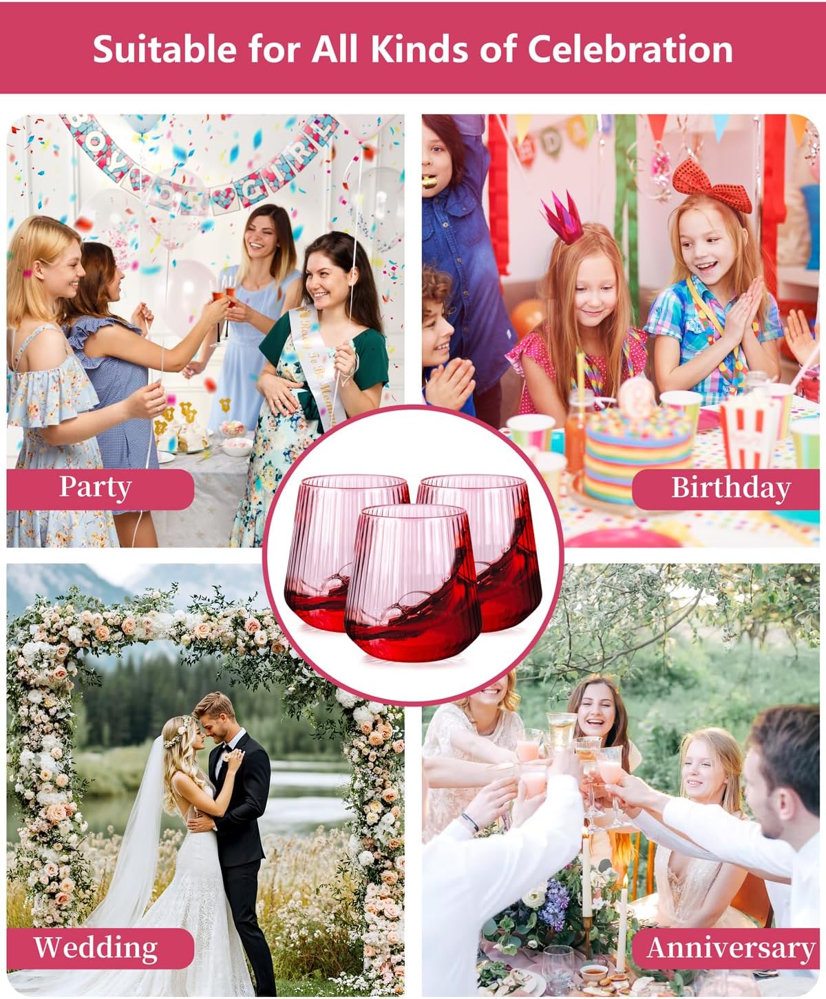 • Premium Quality Pink Plastic:Made from premium quality pink plastic, these plastic stemless wine glasses are durable and less likely to break than glass alternatives, making them ideal for outdoor gatherings and family events. The pink plastic wine cups clear material enhances the visual appeal by showcasing the color and layers of your drinks, giving them a sophisticated touch, while still being practical and lightweight for casual or formal occasions.