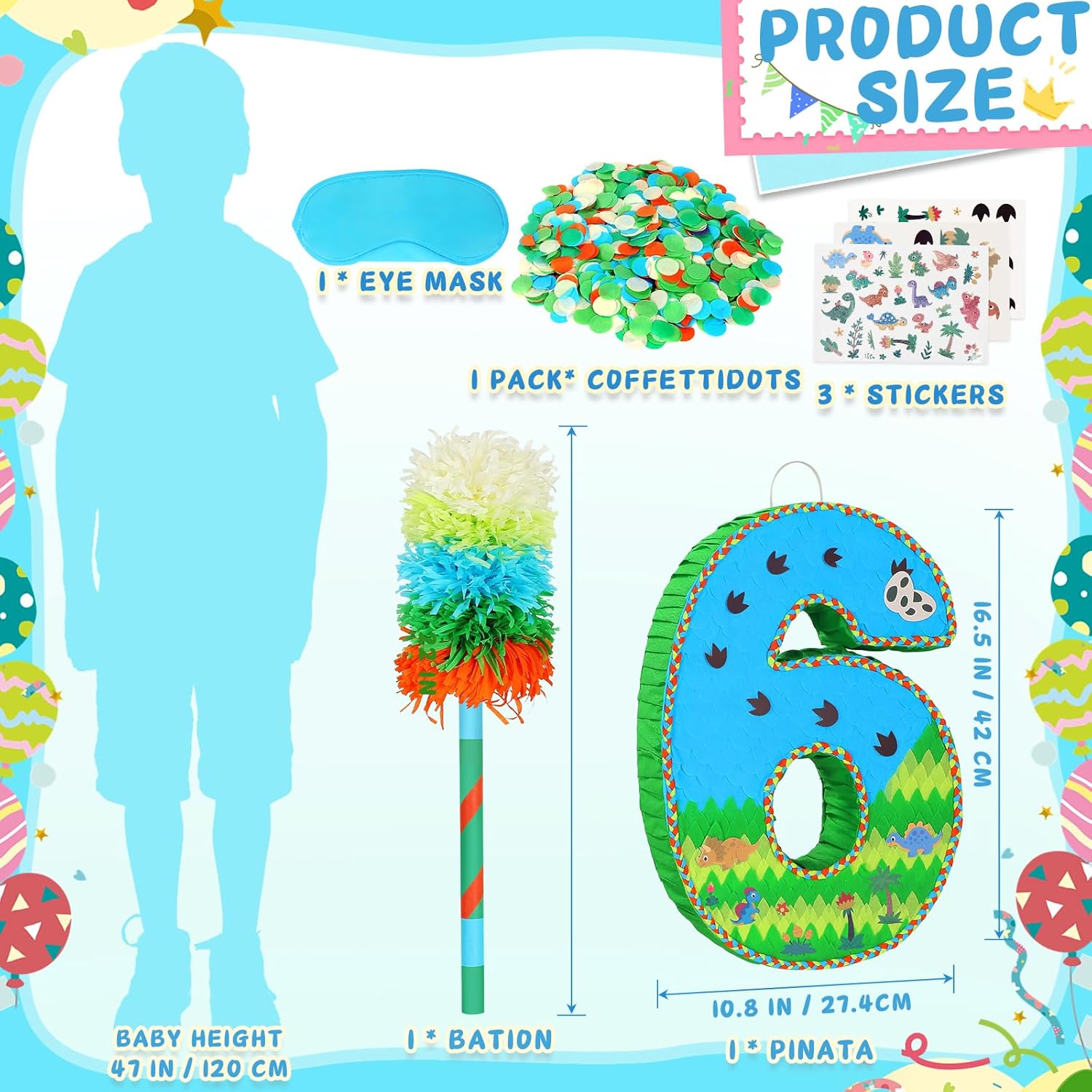 • Happy Birthday Piñata Set: Dinosaur-themed number 6 piñata, perfect for adventurous party decorations. Complete with fabric blindfold, baton, dinosaur-themed confetti and stickers