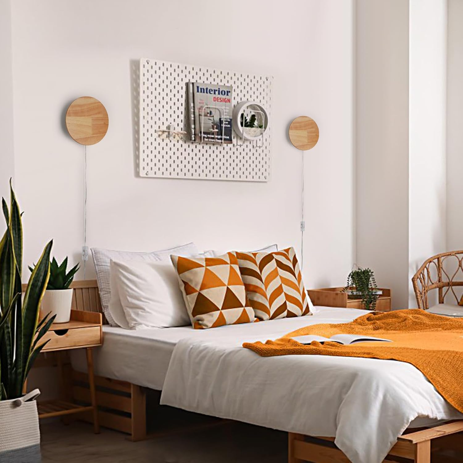 • Modern Minimalist LED Wall Sconces: This is a minimalist stylish LED backlit wall light with plug in cord. The round panel of the lamp is made of solid wood with natural wood grain, and the texture of each lamp is unique. While providing ample lighting to the space, it also adds a touch of chic, modern farmhouse vibes. It is suitable for lighting up various places such as bedroom, living room, hallway, foyer, stairs, office, kid's room, etc.