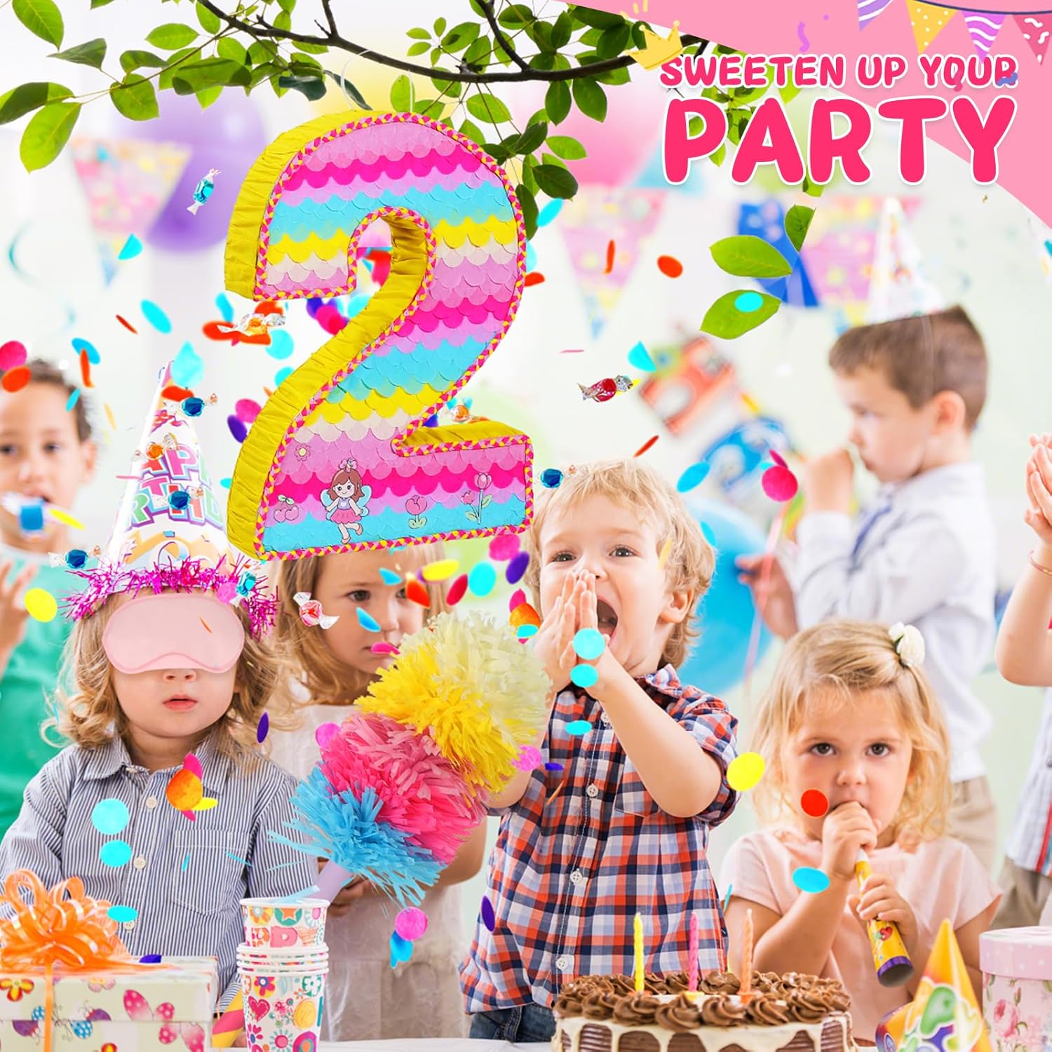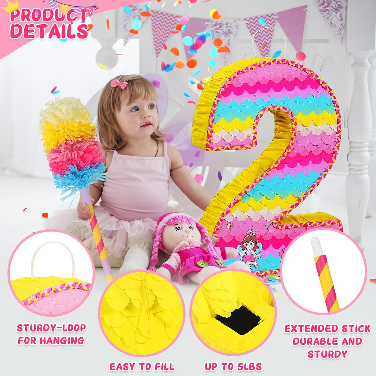 • Happy Birthday Piñata Set: Rainbow-themed number 2 piñata, perfect for pink party decorations, mermaid party decorations. Complete with fabric blindfold, baton, confetti and stickers