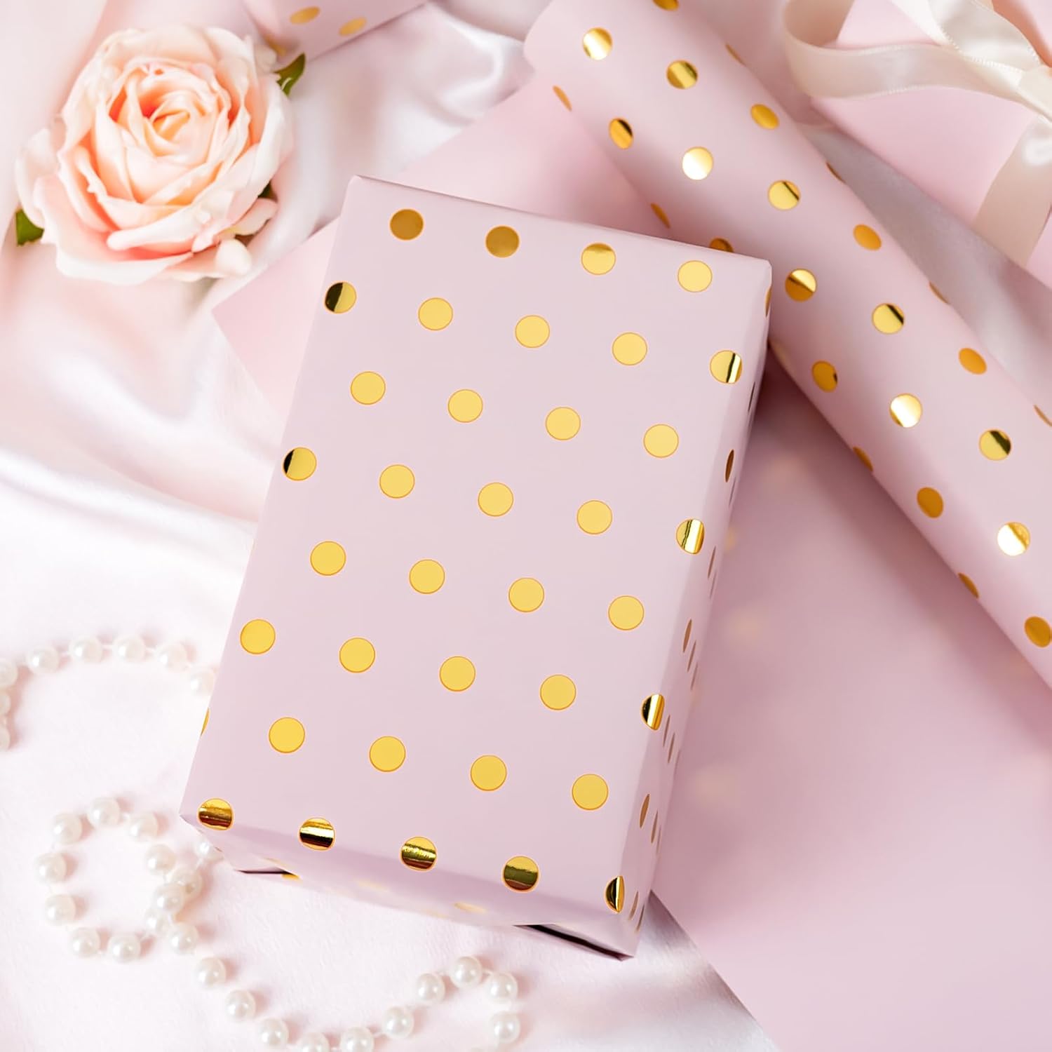 • Reversible Design: The gift wrap is the special gold foil polka dot and suitable for all kinds of packaging.One side features dazzling gold foil polka dots that catch every eye, while the reverse offers a soft, elegant pinkβ€”perfect for crafting hand-wrapped gifts that stand out.