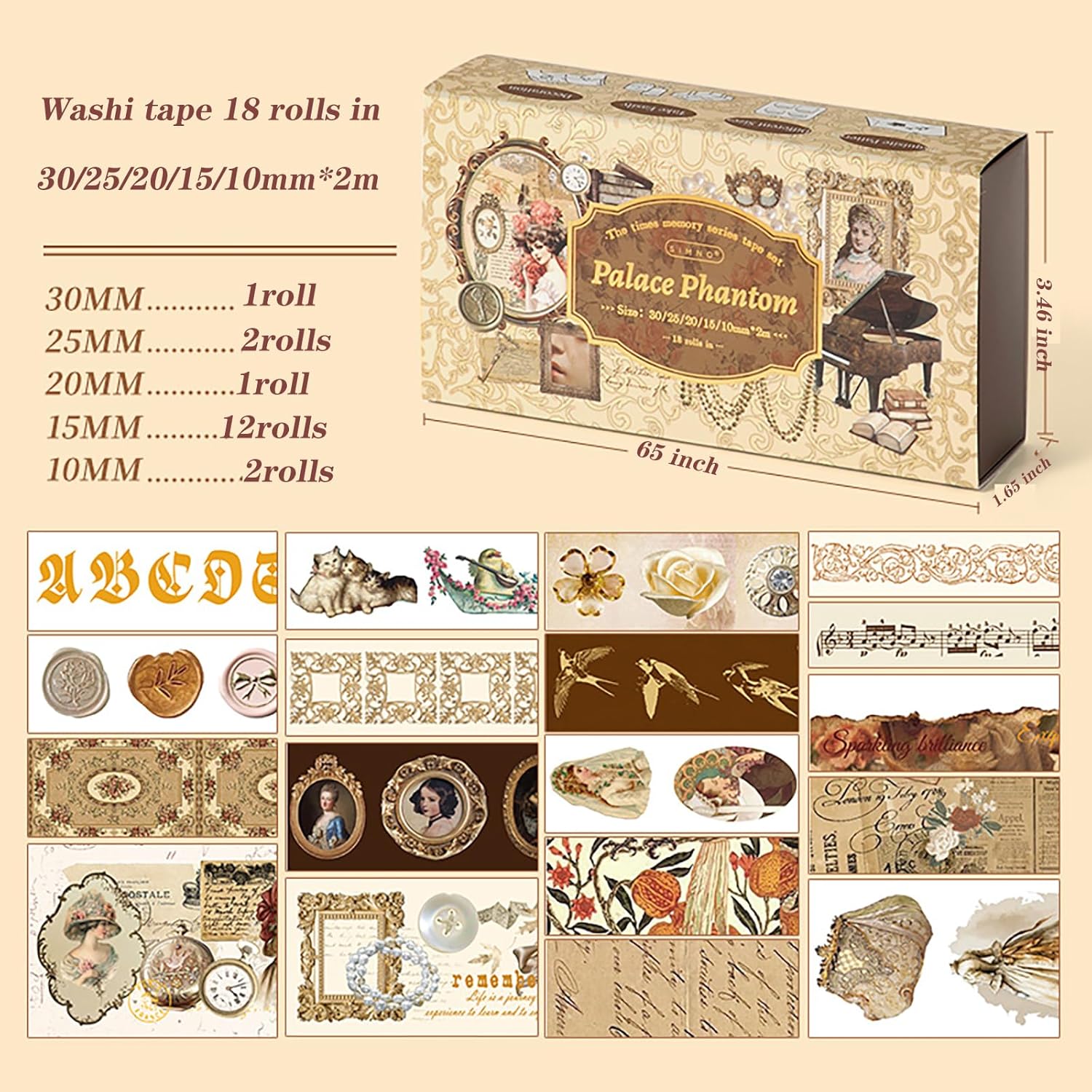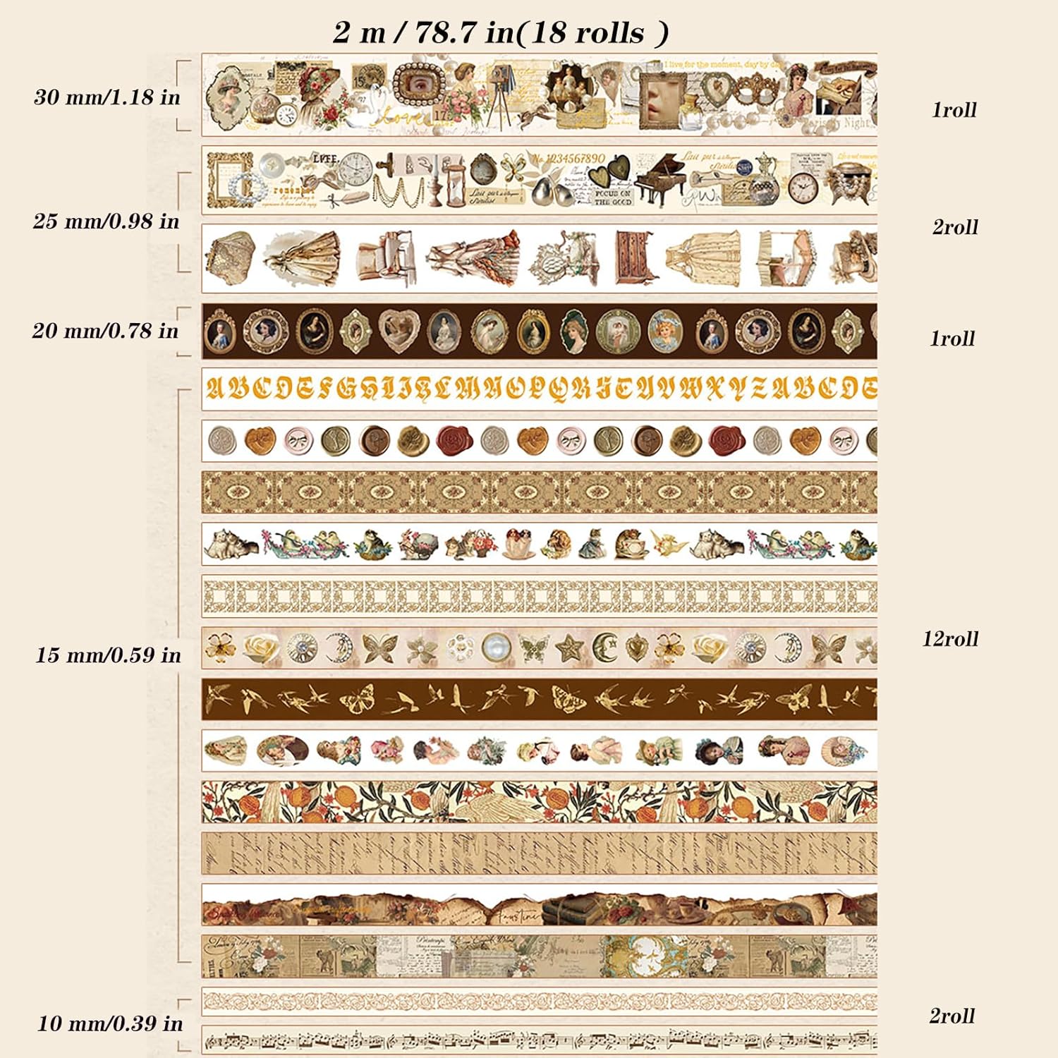 • Our vintage washi tape comes in a box with 18 rolls of high-quality washi tape in five sizes, including wide and thin washi tape. Each roll is 1.18 inches (30 mm) x 1 tape; 0.98 inches (25 mm) x 2 tapes; 0.78 inches (20 mm) x 1 tape; 0.59 inches (15 mm) x 12 tapes; 0.39 inches (10 mm) x 2 tape.