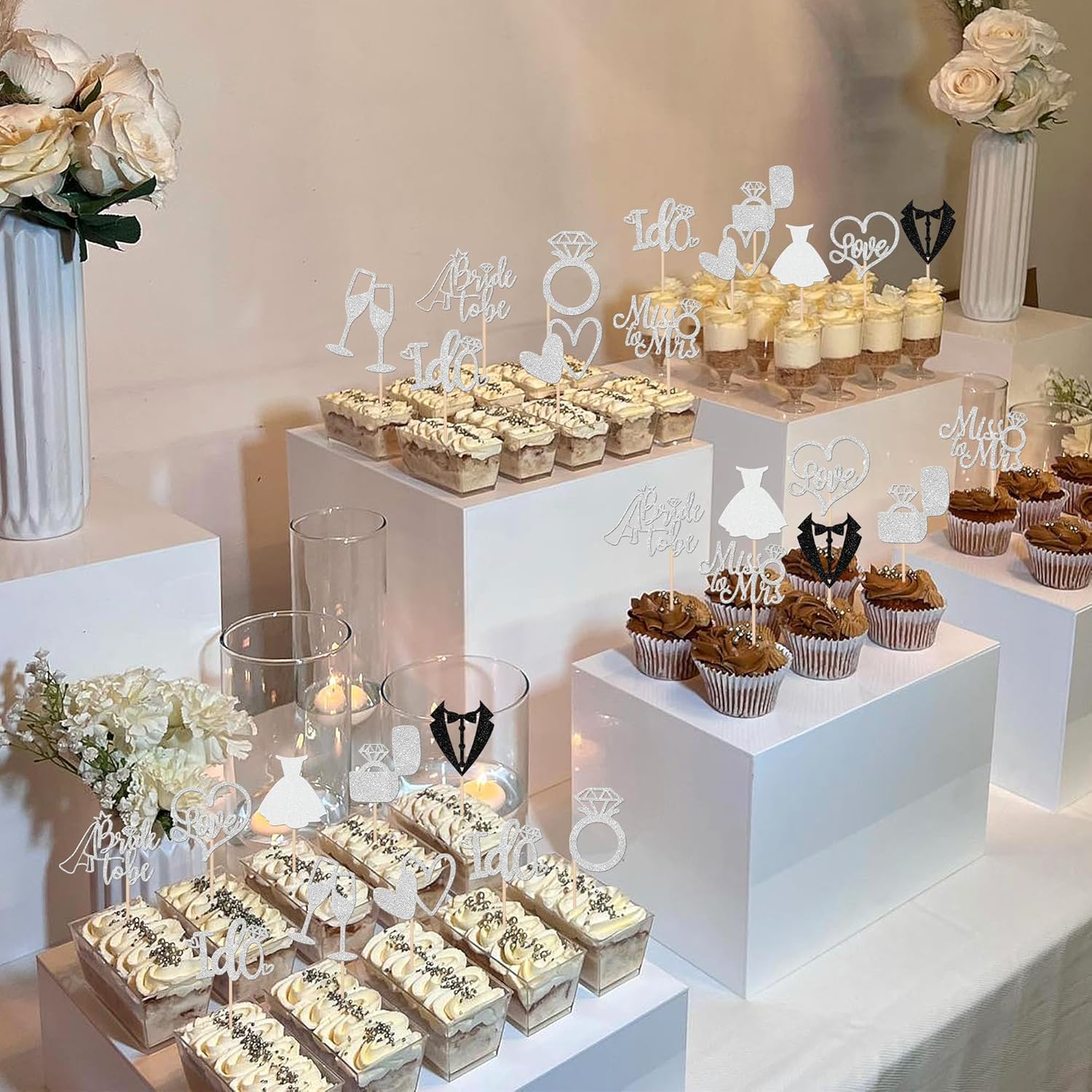 30 PCS Bride to Be Cupcake Toppers Glitter Wedding Cupcake Decorations I Do Love Heart Ring Miss to Mrs Cupcake Picks for Wedding Engagement Bridal Shower Party Cake Decorations Supplies Silver