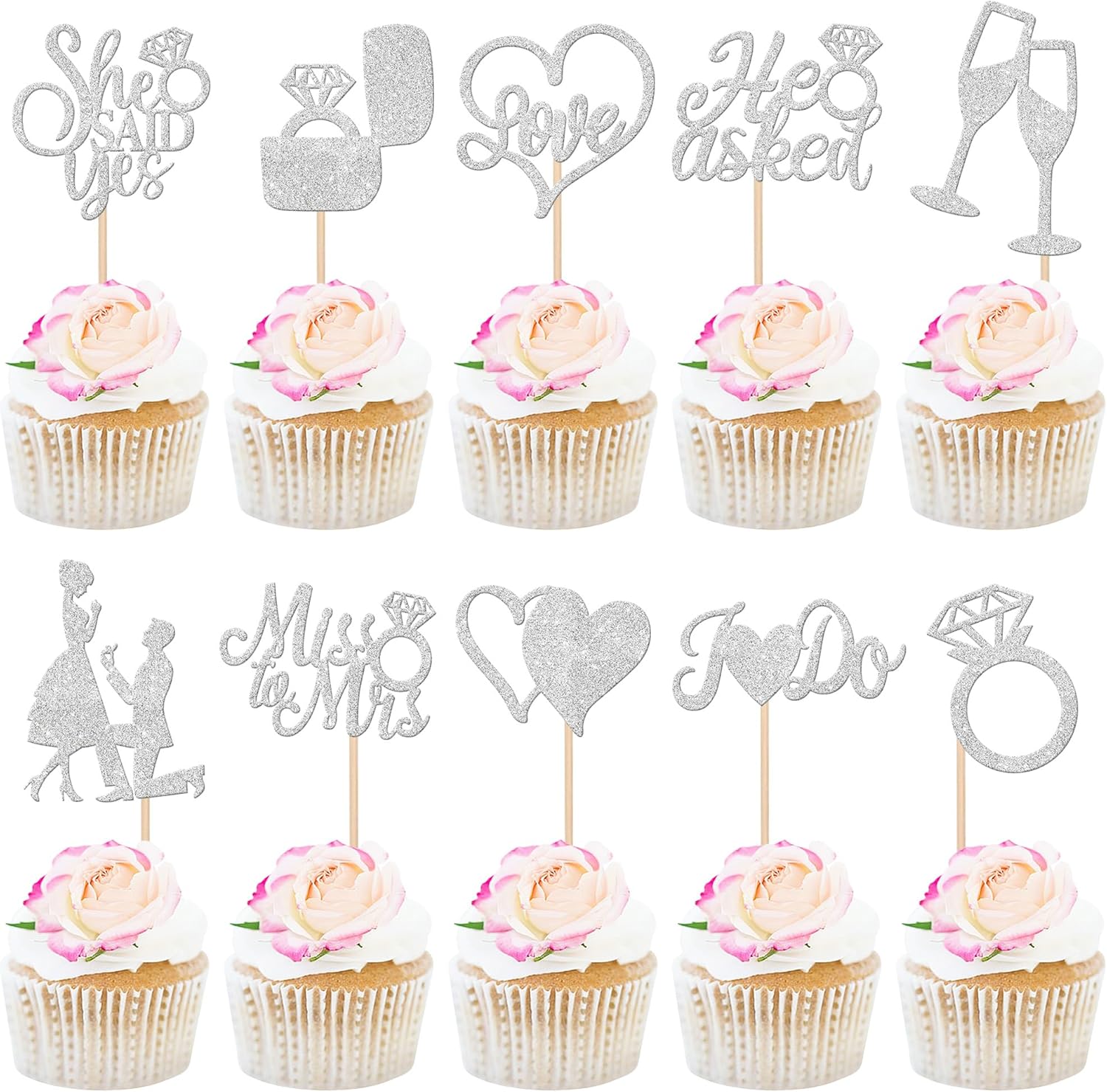 30 PCS He Asked She Said Yes Cupcake Toppers Engagement Cupcake Toppers Miss to Mrs I Do Love Heart Ring Miss to Mrs Cupcake Picks for Wedding Engagement Party Cake Decorations Supplies Silver