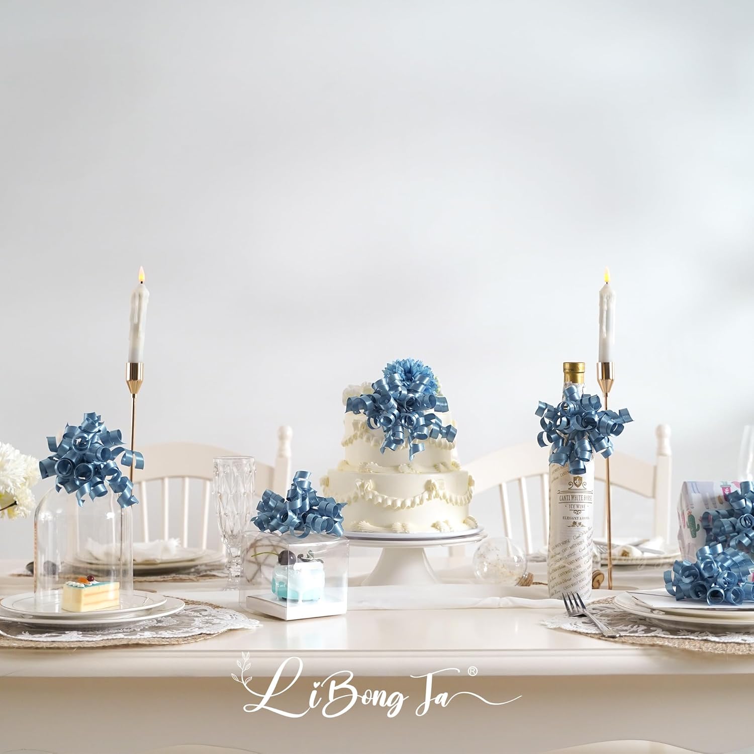 5'' Dusty Blue Bows Curly Ribbon Bows for Gift Wrapping, Satin Bows with Double-Sided Tape, Self Adhesive Bows for Party, Wedding, Birthday Decor, Premade Bows for Crafts, Wine Glasses-8 PCs