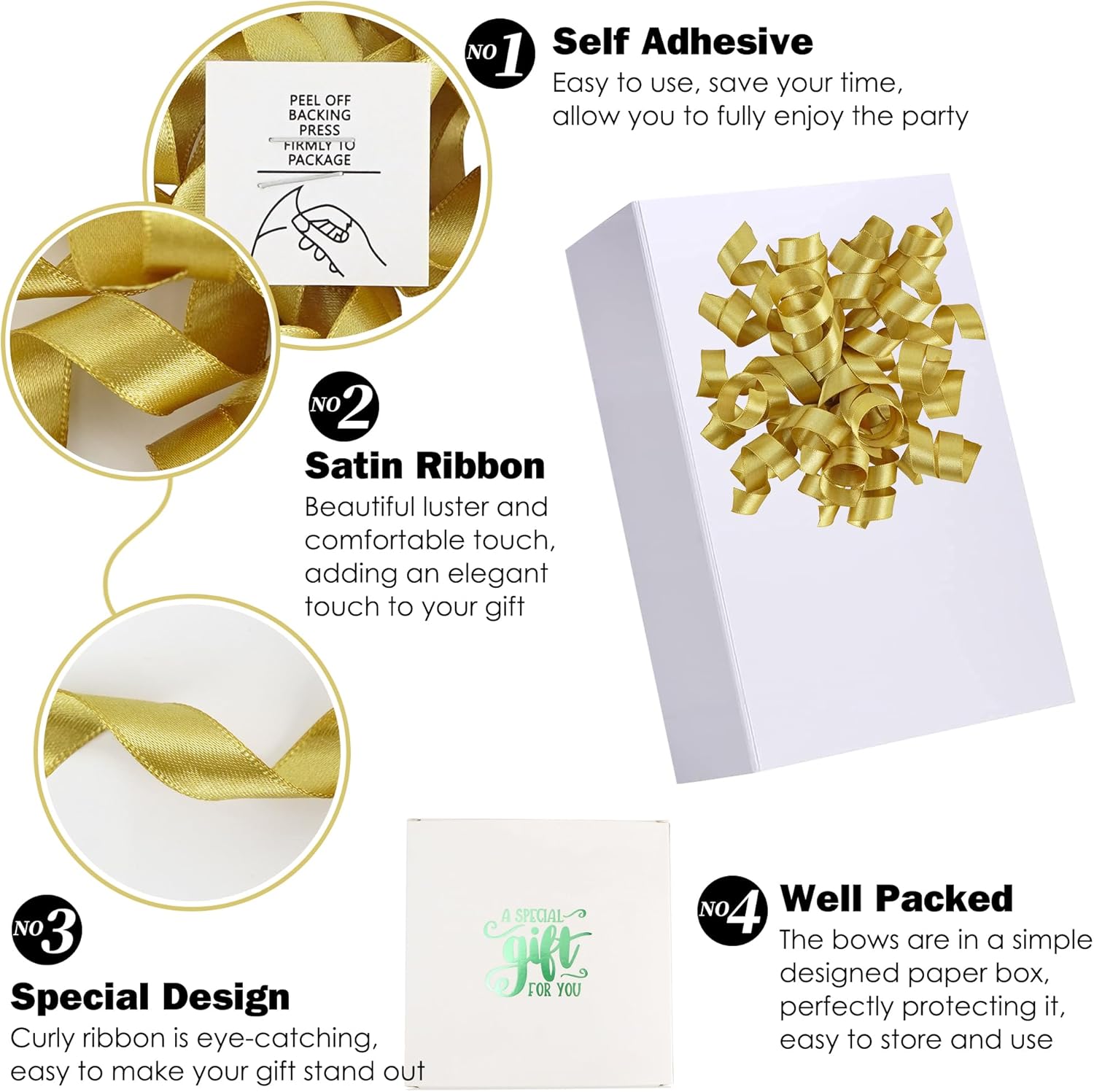 5 Inch Gold Bows Curly Ribbon Bows for Gift Wrapping, Satin Bows with Double-Sided Tape, Self Adhesive Bows for Party, Wedding, Birthday Decor, Premade Bows for Crafts, Wine Glasses-8 PCs