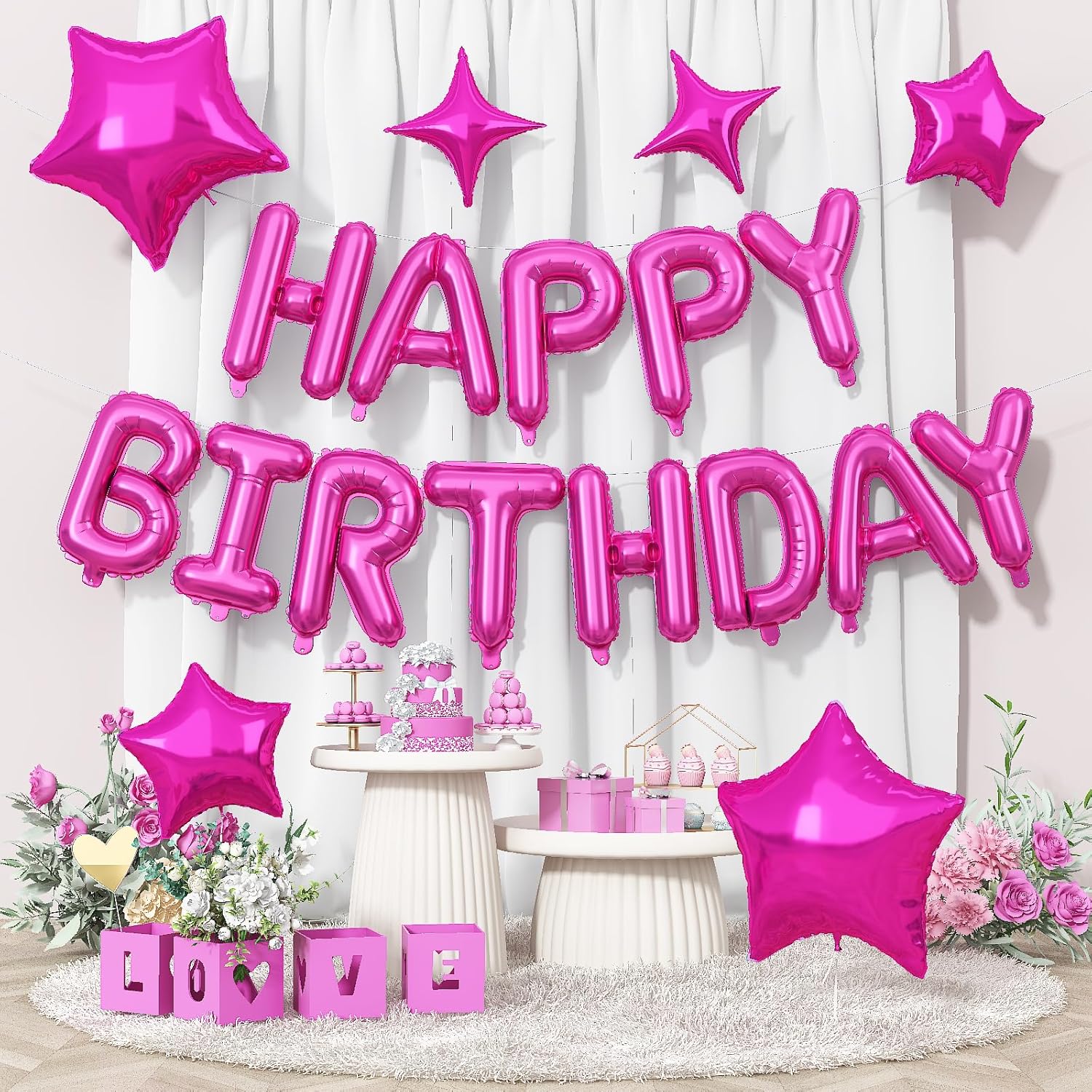 • VALUABLE PARTY DECORATION SET – Create an unforgettable birthday celebration with our Happy Birthday Balloons Banner set! Includes a 16-inch hot pink Mylar Foil Letter Balloons set, 4 hot pink star balloons, plus essential accessories like a ribbon, glue dots, and a straw for easy setup. Everything you need for a stylish and hassle-free party!